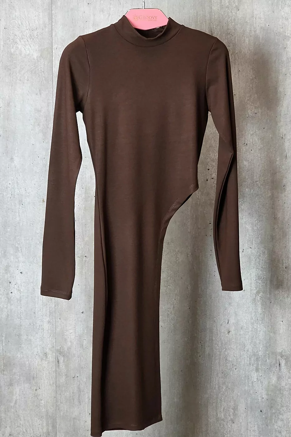 Blusa manga longa, com modelagem assimétrica e gola alta.