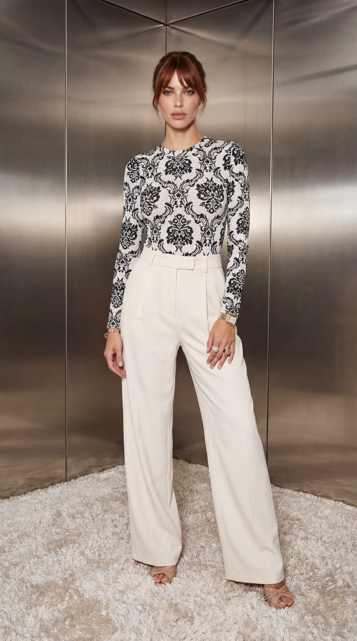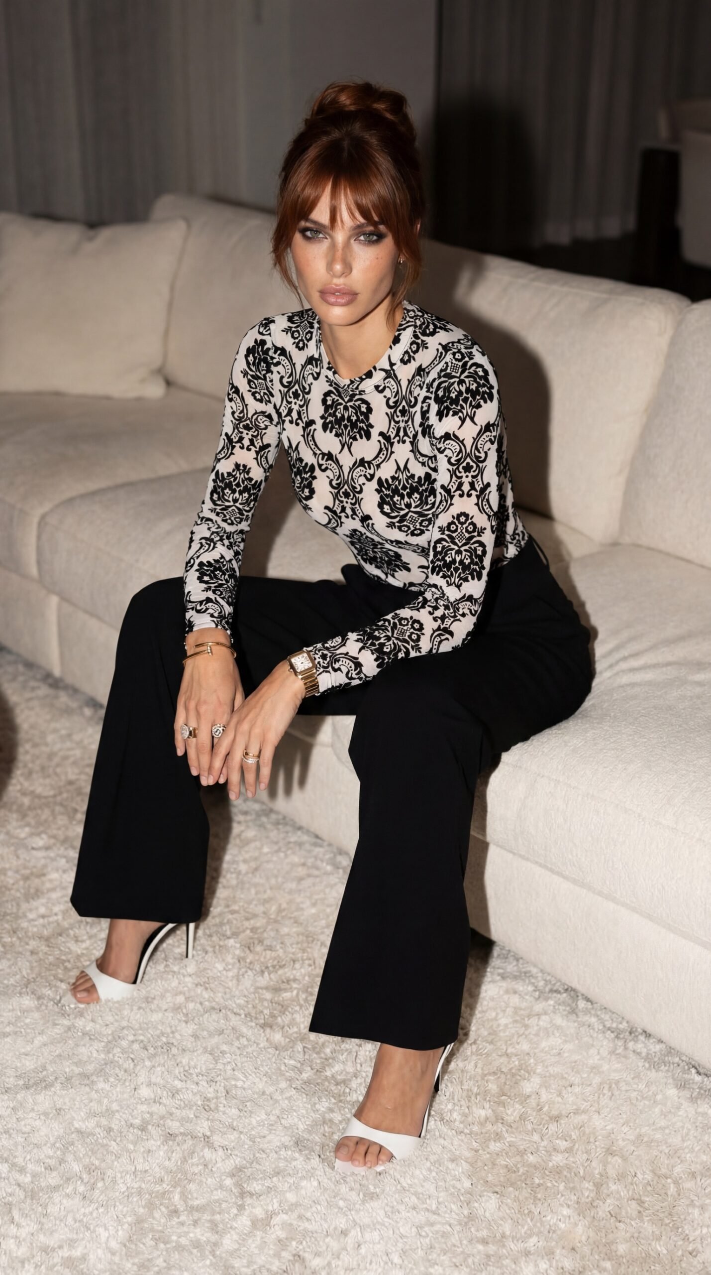 Sua modelagem ajustada ao corpo valoriza a silhueta com elegância, enquanto as mangas longas trazem um ar refinado e versátil, ideal para produções que transitam do dia para a noite. A estampa em arabescos clássicos em contraste cria um efeito visual sofisticado e atemporal, elevando qualquer look.