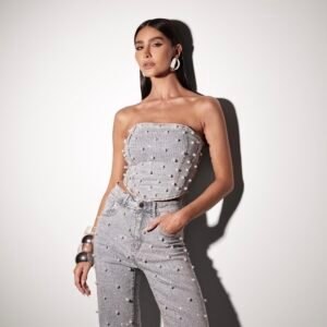 A cintura intermediária conta com cós estruturado, passantes e fechamento tradicional, garantindo ajuste perfeito ao corpo. Bolsos frontais e traseiros reforçam a estética jeans clássica, enquanto o brilho das aplicações transforma a peça em um verdadeiro item statement — ideal para eventos, festas, produções fashionistas ou para elevar looks casuais com muito estilo.