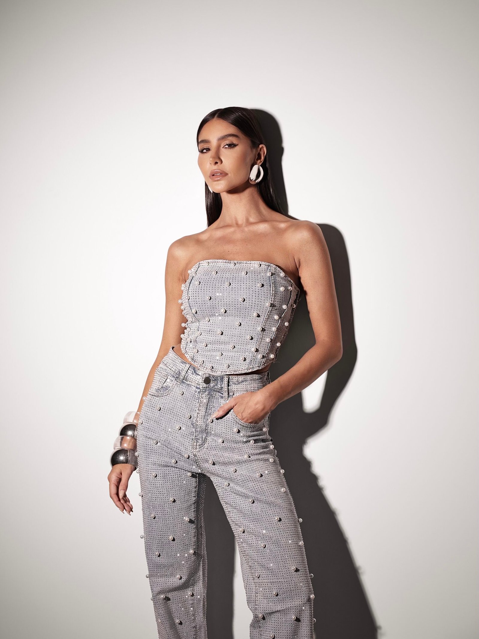 A Calça Jeans Strass & Pérolas Celebration é uma peça exclusiva que eleva instantaneamente qualquer produção. Confeccionada em denim estruturado com textura quadriculada sutil, ela une a casualidade do jeans ao luxo das aplicações manuais, criando um visual absolutamente marcante.