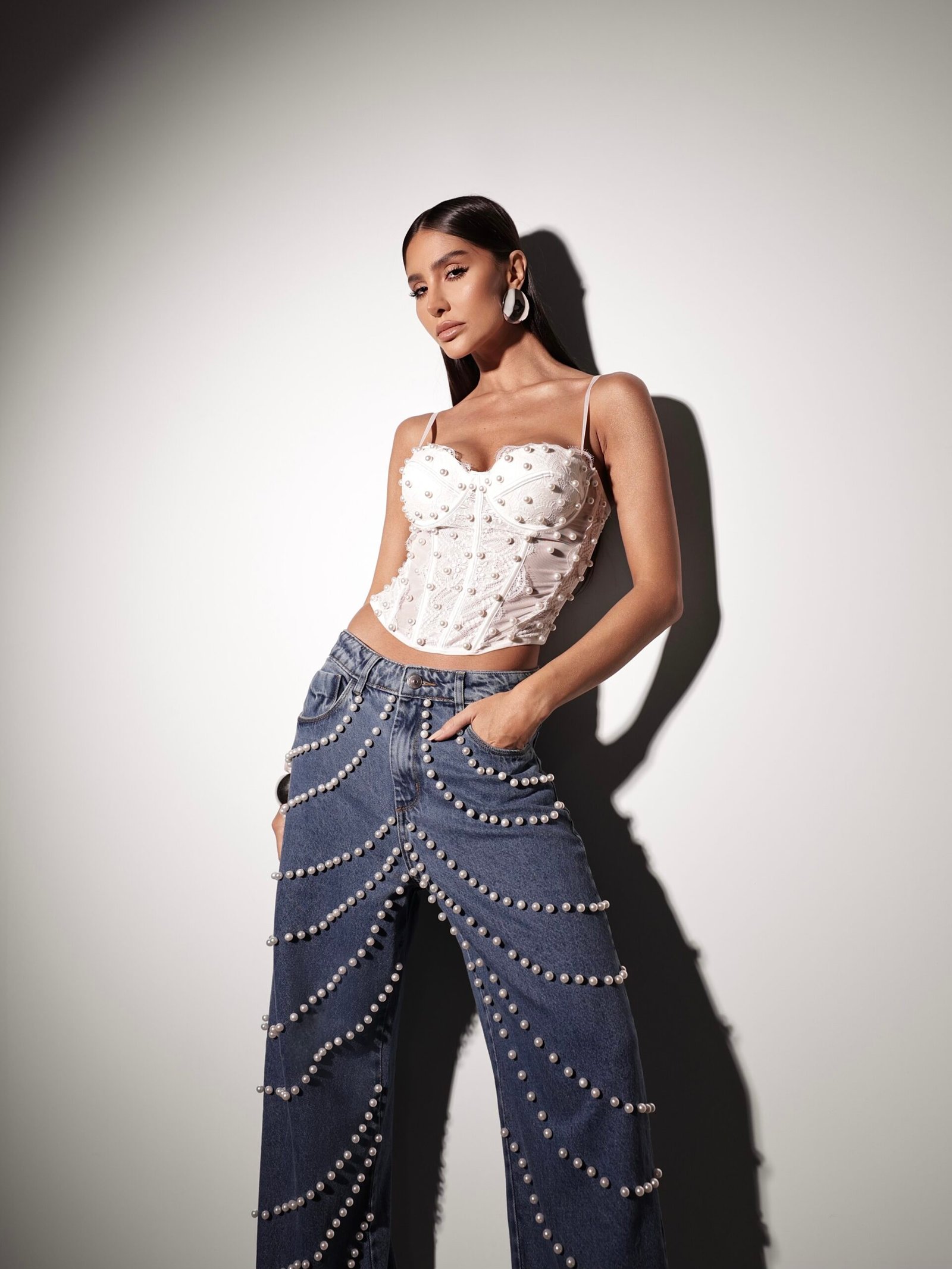 O grande destaque da peça são as aplicações de pérolas distribuídas em curvas simétricas por toda a parte frontal e lateral da calça. Cada pérola é fixada manualmente, criando um efeito visual tridimensional e glamouroso que transforma o jeans em uma verdadeira obra de moda. As linhas curvas acompanham o caimento da peça, destacando o movimento natural das pernas e criando um desenho único e elegante.
