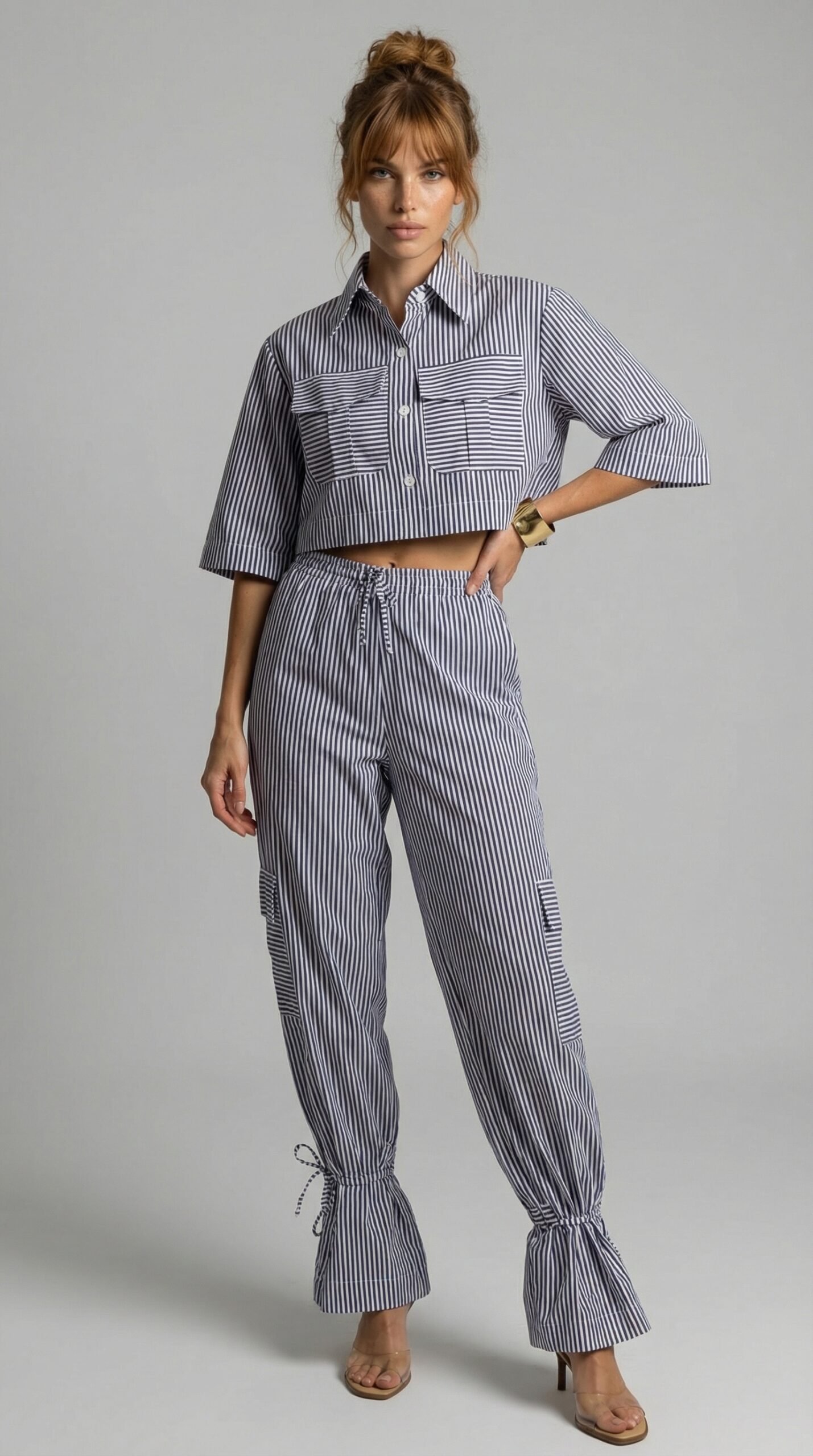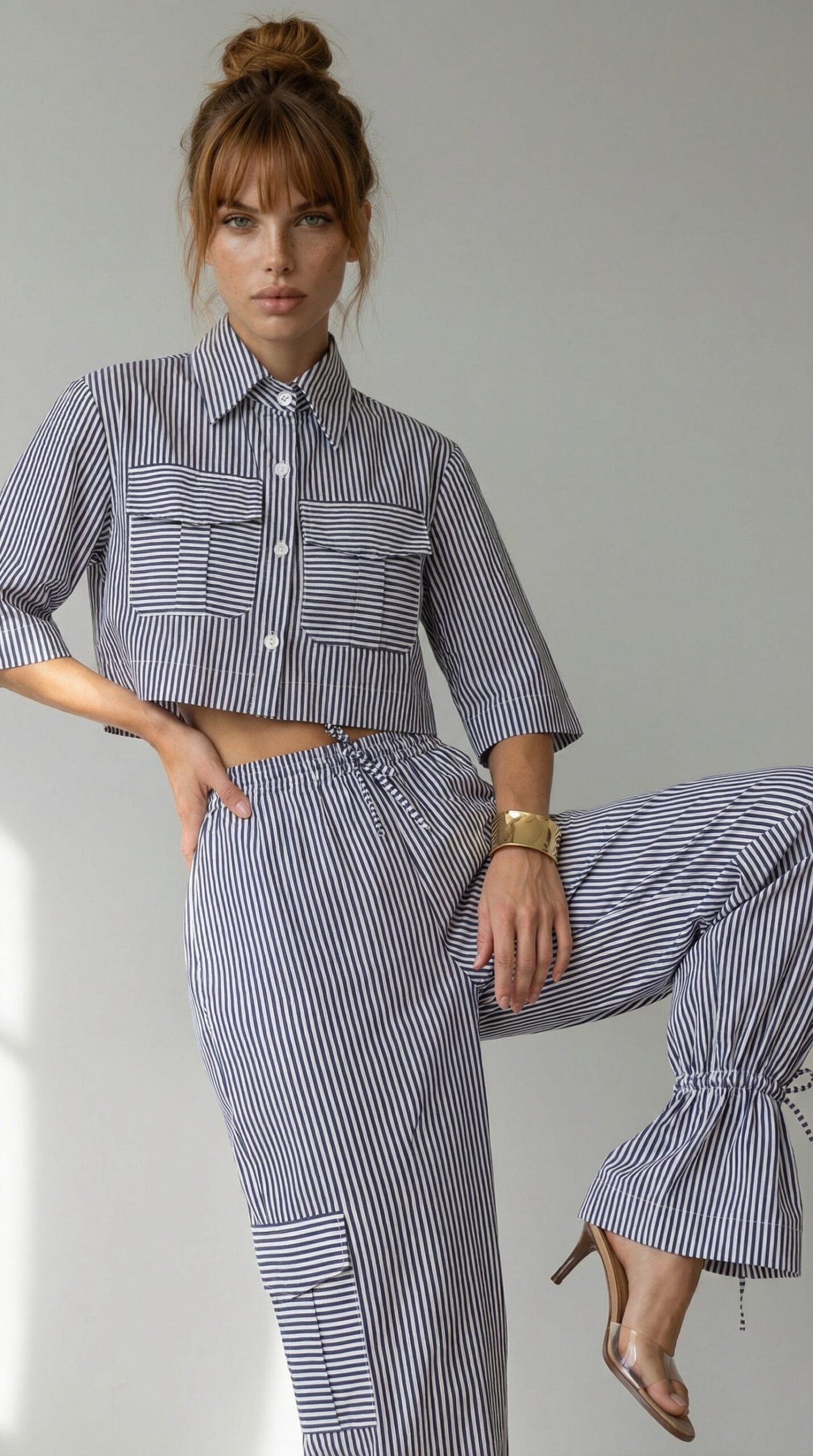 A camisa cropped listrada é a peça ideal para quem busca um visual moderno com toque utilitário e elegante. Confeccionada em tecido leve e estruturado, ela oferece conforto e ótimo caimento, perfeita para composições versáteis.