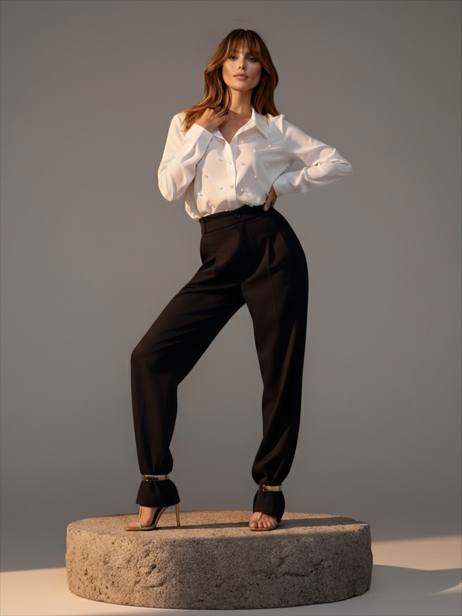 A Camisa de Alfaiataria com Pérolas traduz a elegância clássica em uma peça moderna e sofisticada.