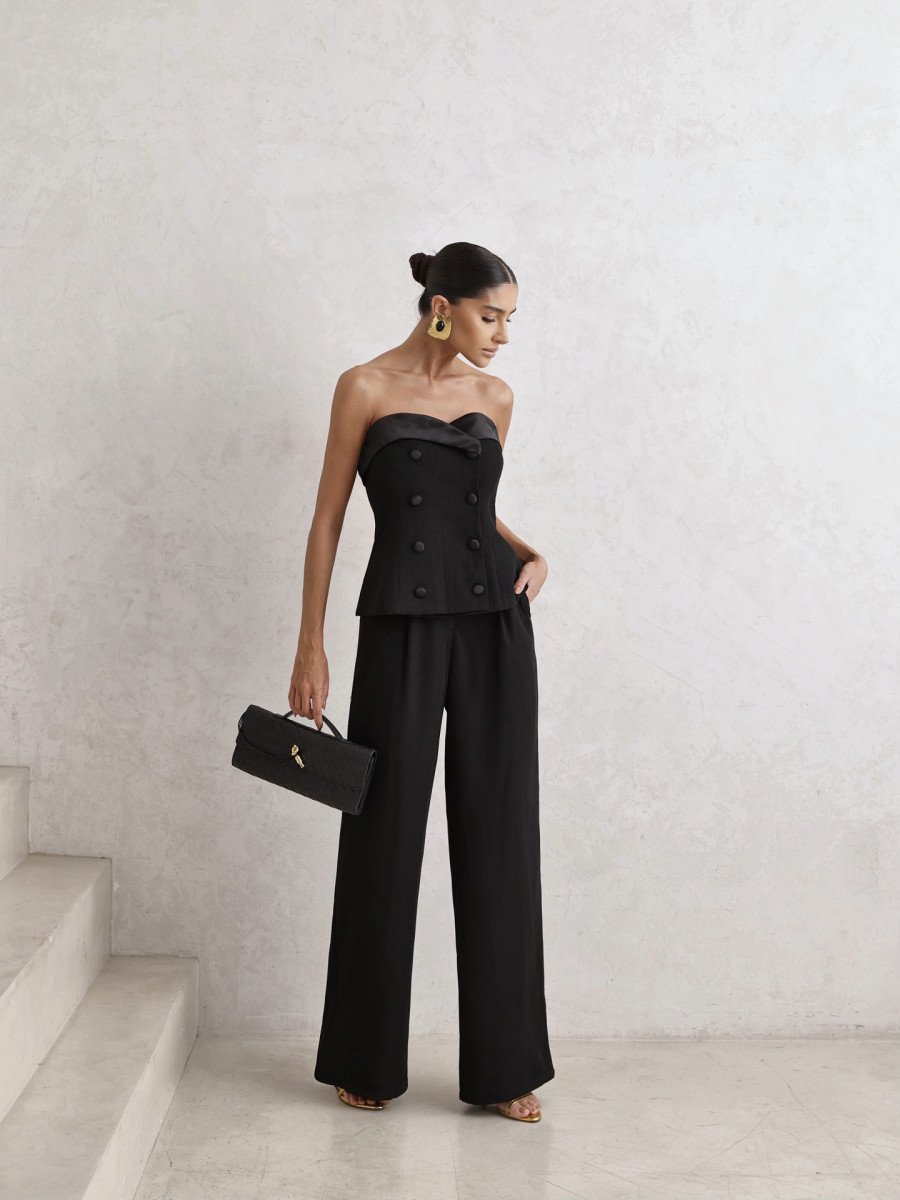 Confeccionado em crepe de alfaiataria, o conjunto é composto por cropped estruturado tomara que caia e calça de modelagem pantalona. O cropped possui corte impecável, com detalhe de abotoamento duplo frontal inspirado em blazer, decote levemente coração e caimento ajustado que valoriza a silhueta com sofisticação.