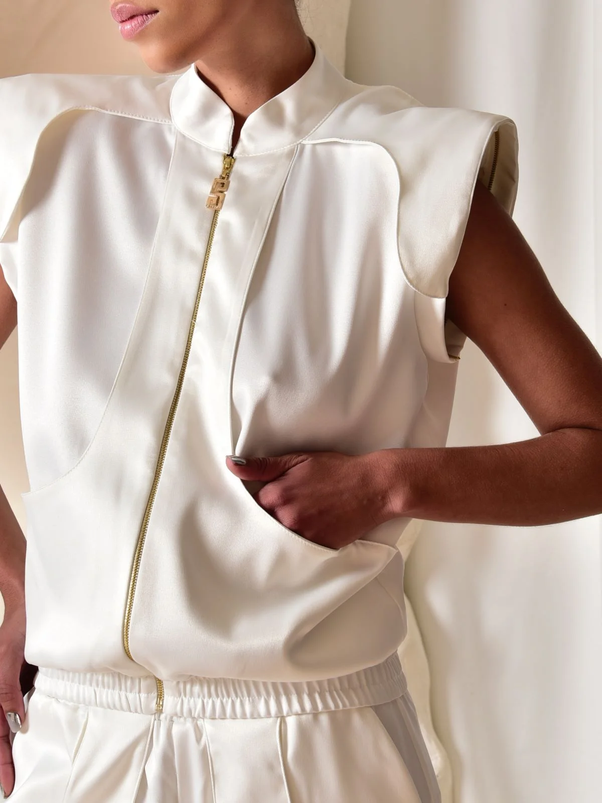 Jaqueta com zíper frontal e mangas removíveis para diferentes composições