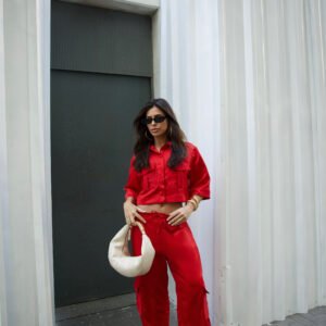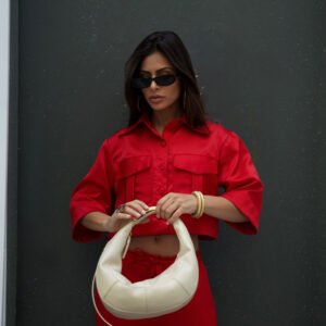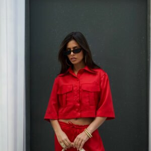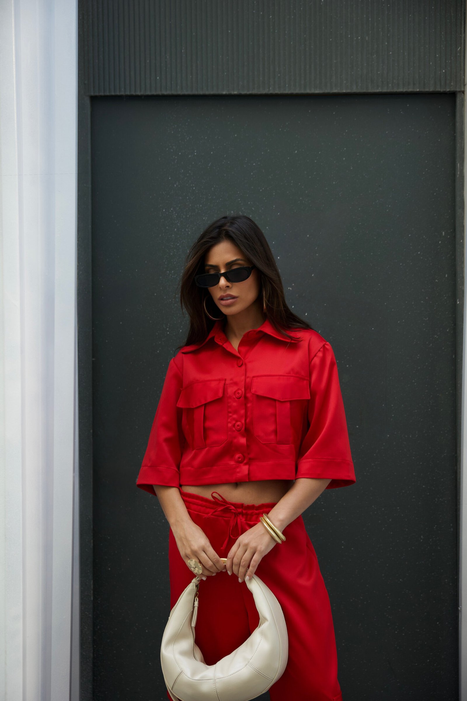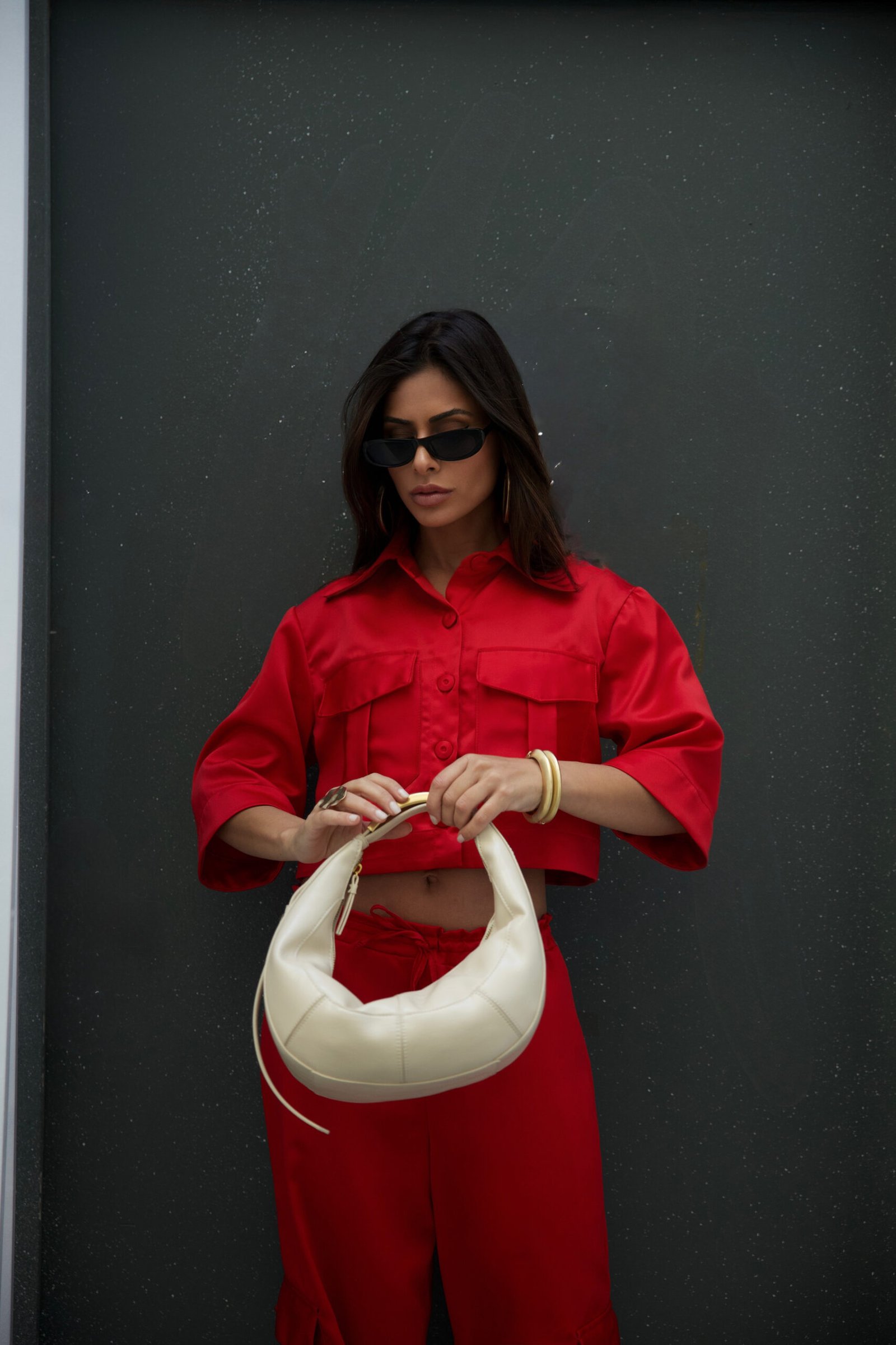 O cropped possui modelagem estruturada, comprimento na medida certa e fechamento frontal por botões, além de bolsos utilitários no busto que reforçam a proposta cargo chic. As mangas alongadas trazem equilíbrio ao design, valorizando a silhueta.