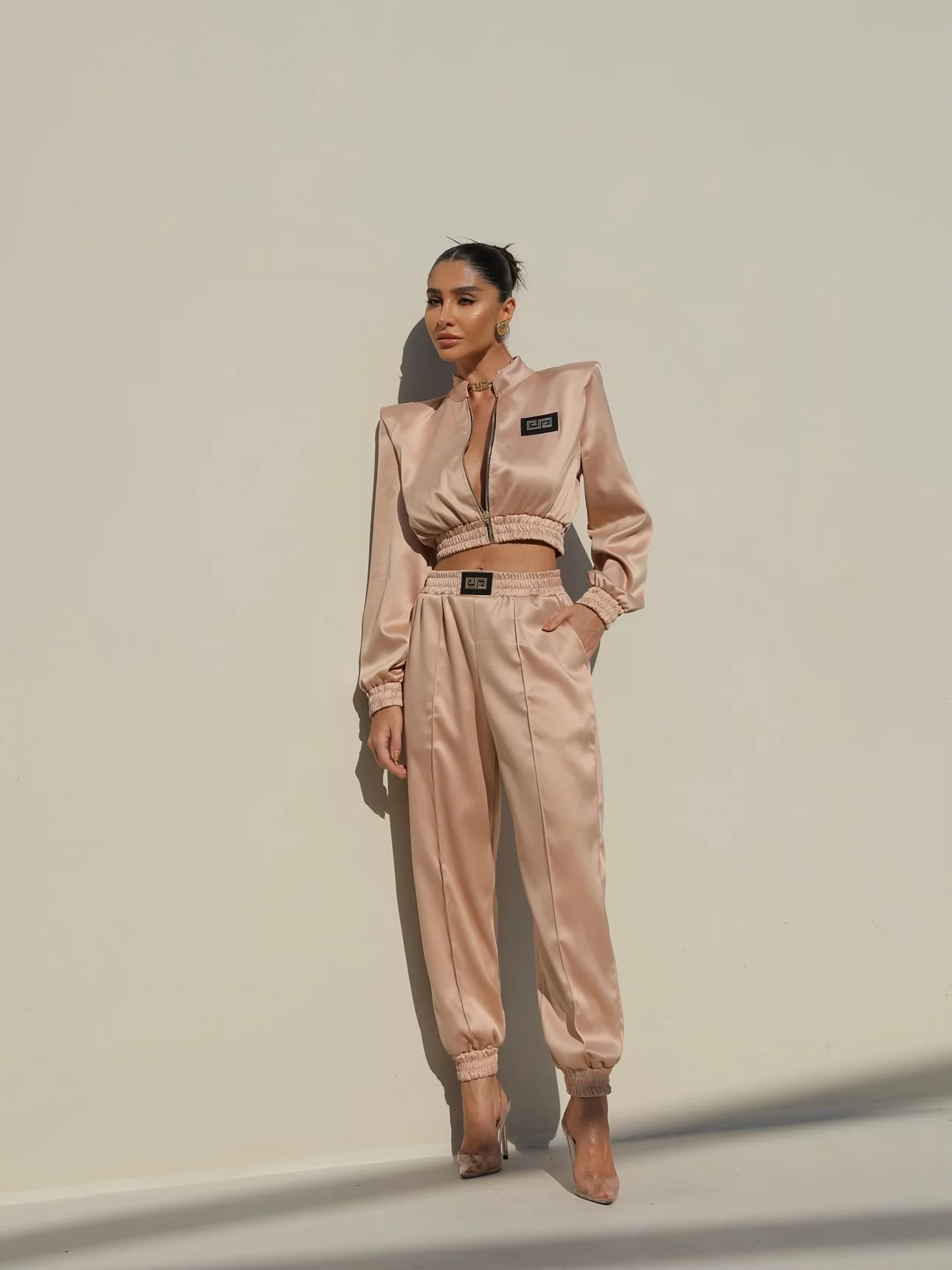 O Conjunto em Cetim Jaqueta e Calça Bomber Kady é a combinação perfeita de luxo e estilo. Confeccionado em cetim com brilho acetinado, o conjunto é composto por uma jaqueta com ombreiras estruturadas e uma calça bomber. Ambas as peças possuem etiquetas de couro com detalhes em metal dourado, agregando um toque sofisticado.