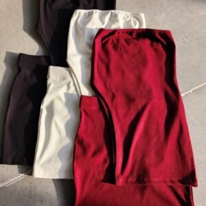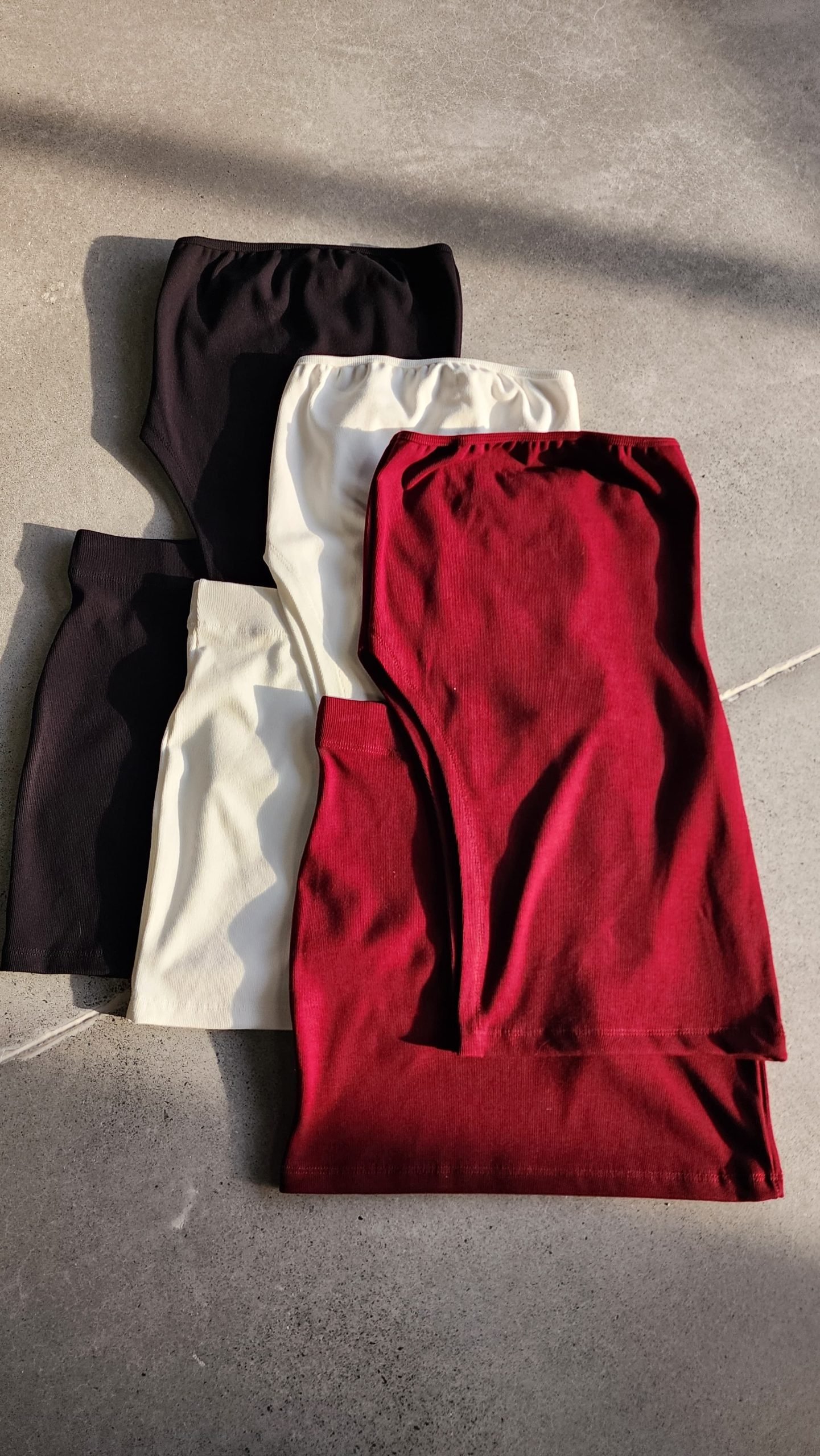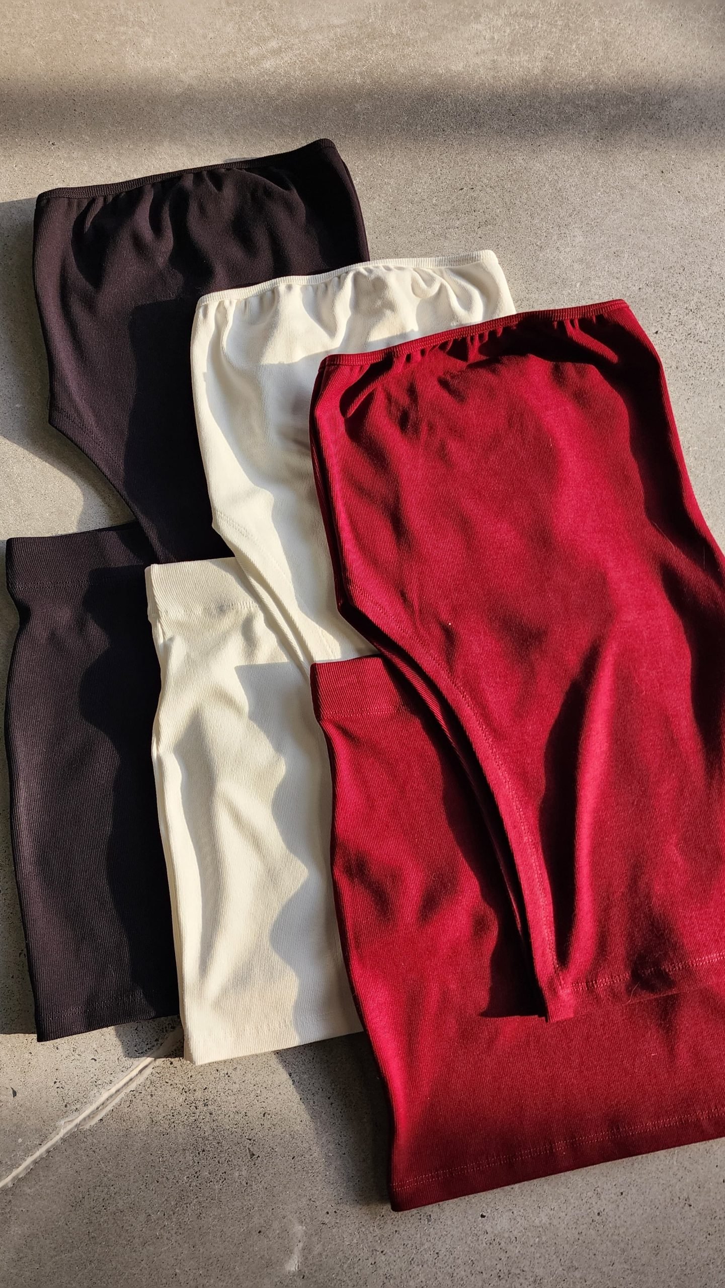 Conjunto de saia + blusa tomara que caia alongada, assimétrica e com recorte lateral.