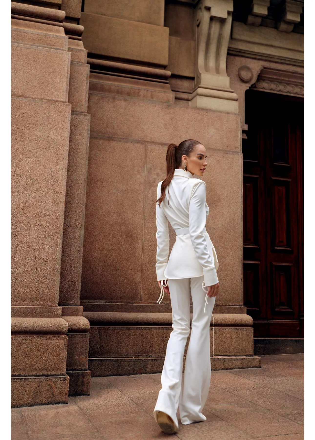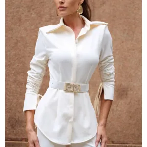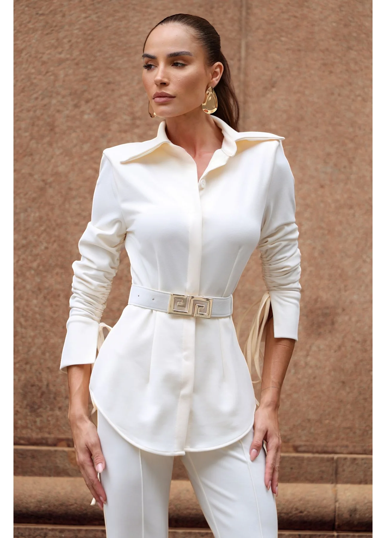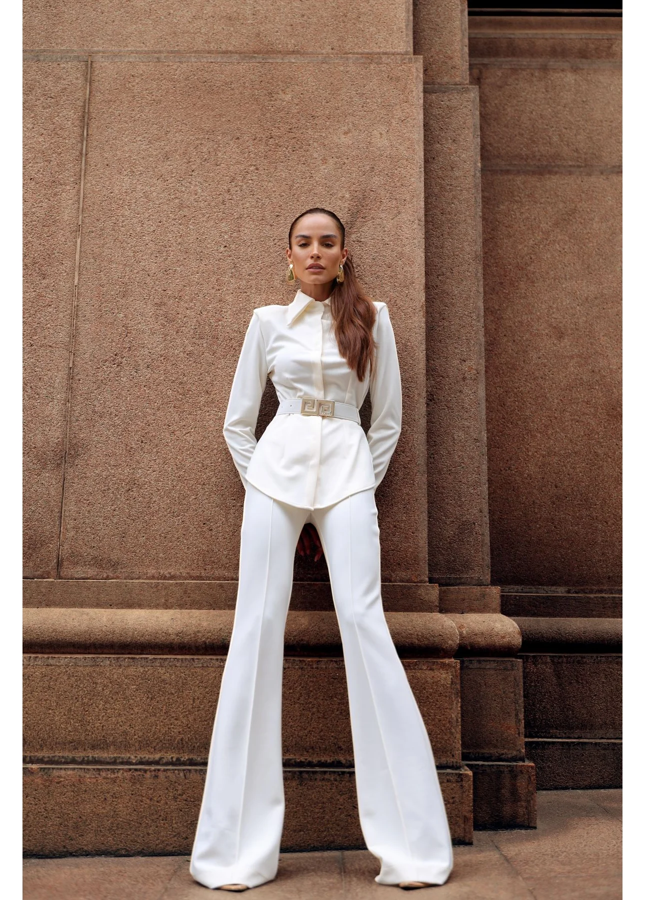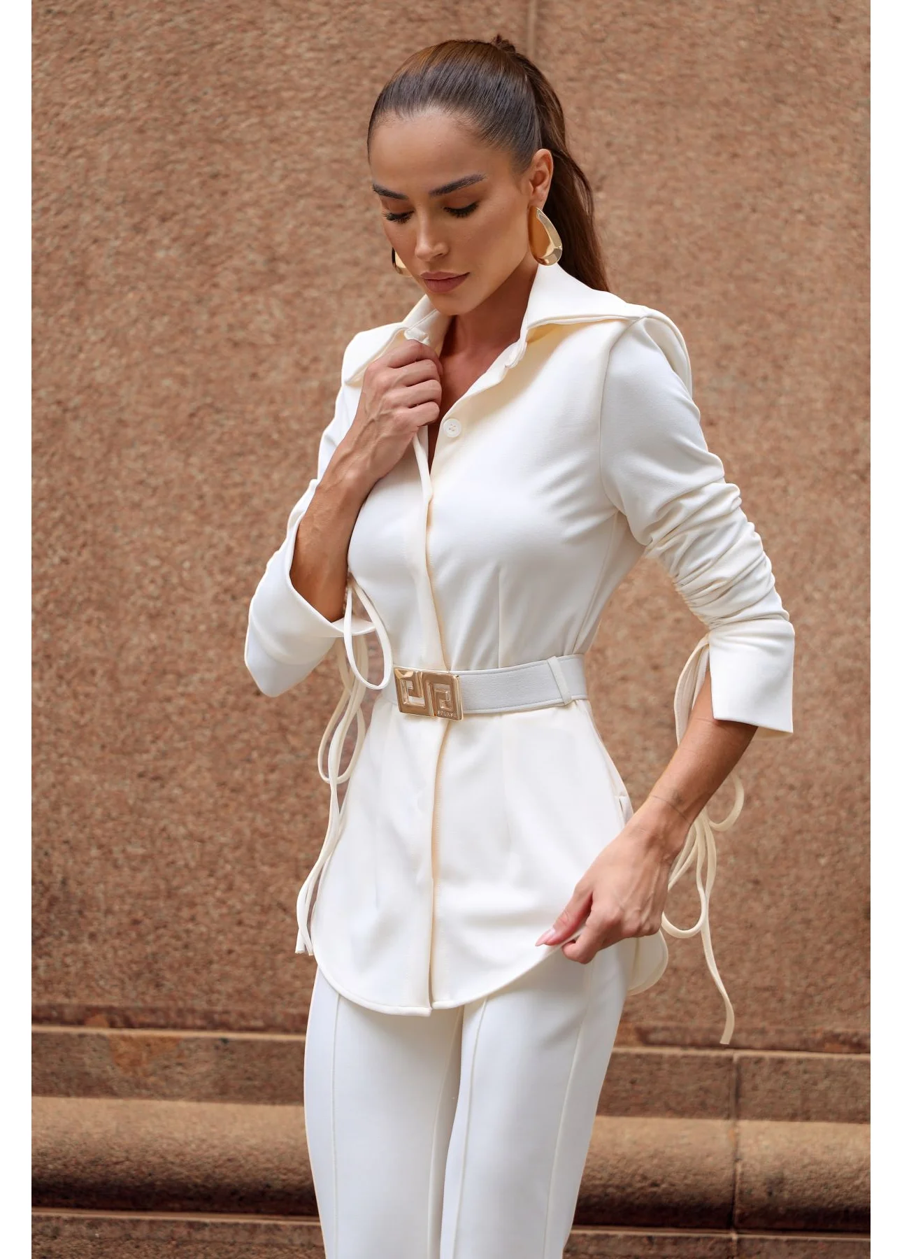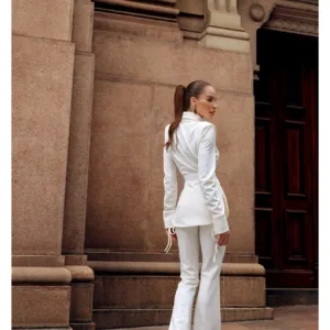 A camisa estruturada com amarração lateral é o ponto de destaque do look, desenhando o corpo com sutileza e trazendo um toque fashion à composição. A calça flare alonga a silhueta e equilibra o visual com movimento e sofisticação, resultando em um conjunto harmonioso e poderoso.