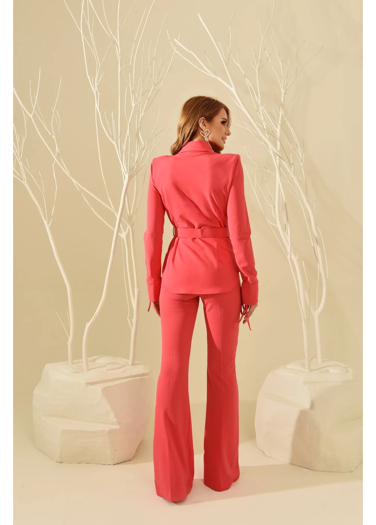 A camisa estruturada com amarração lateral é o ponto de destaque do look, desenhando o corpo com sutileza e trazendo um toque fashion à composição. A calça flare alonga a silhueta e equilibra o visual com movimento e sofisticação, resultando em um conjunto harmonioso e poderoso.
