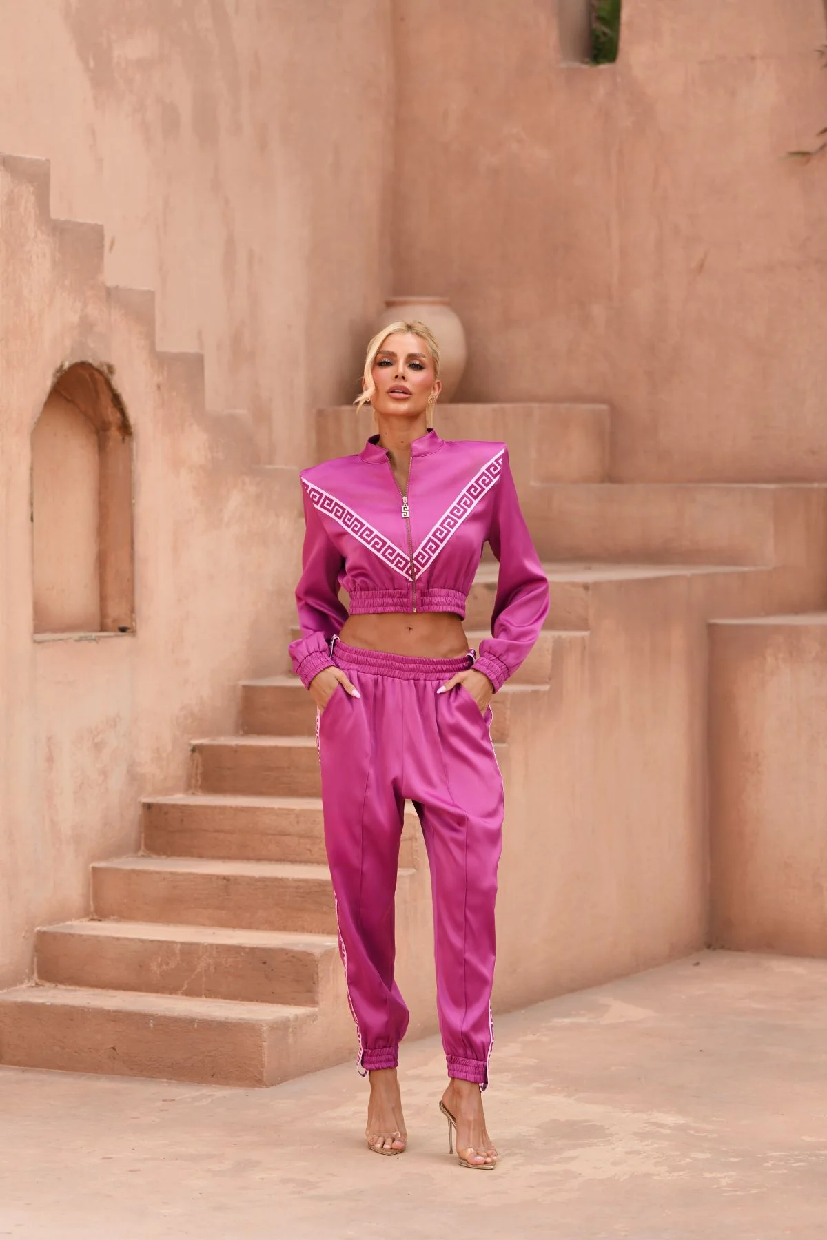Conjunto em tecido acetinado com leve brilho