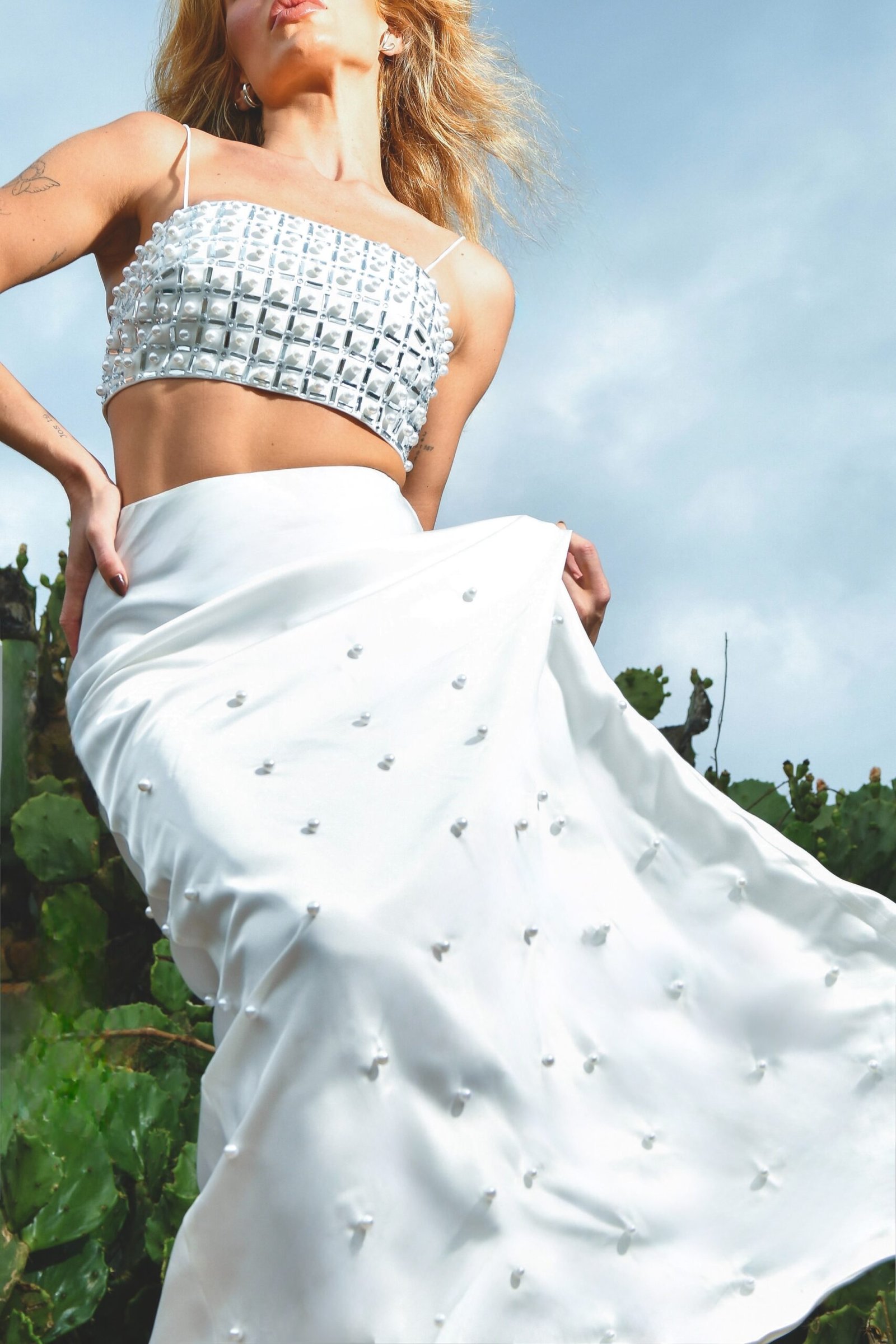 A saia longa, em cetim de caimento impecável, apresenta modelagem reta e fluida, enriquecida por pérolas aplicadas à mão, que criam um efeito sofisticado e romântico. O comprimento super long amplia a silhueta e garante movimento elegante a cada passo.