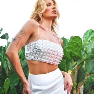 O cropped é confeccionado com base estruturada e possui aplicações luxuosas de brilhos e pérolas, formando um desenho geométrico que destaca o busto com muito glamour. As alças finas trazem leveza e um toque delicado ao visual.