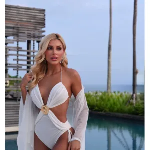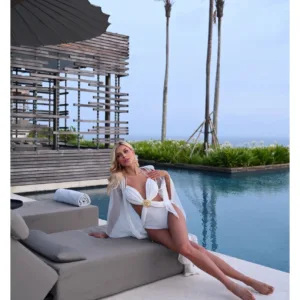 O maiô possui recortes estratégicos que valorizam a silhueta, enquanto a saída fluida traz movimento e leveza, completando um visual luxuoso.
