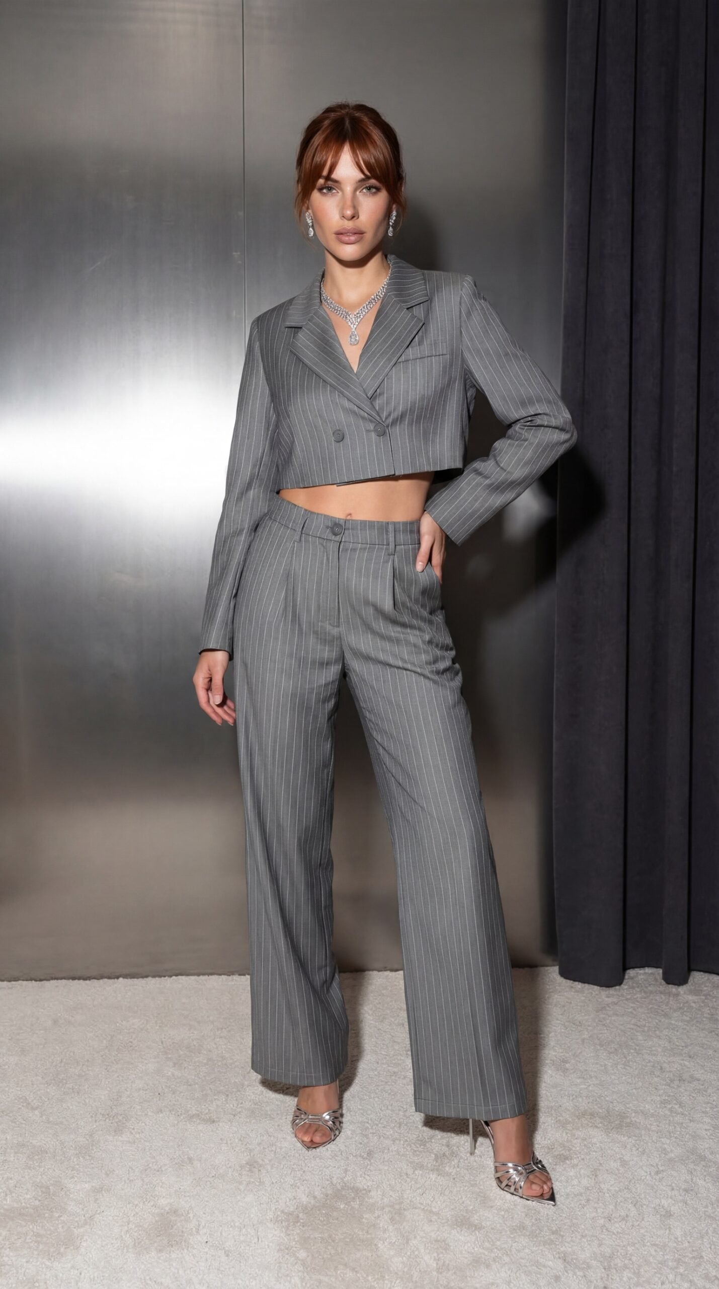 Conjunto em alfaiataria premium com padronagem risca de giz, que traduz elegância moderna com um toque fashionista marcante. Confeccionado em tecido estruturado de alta qualidade, proporciona caimento impecável, conforto e acabamento refinado.