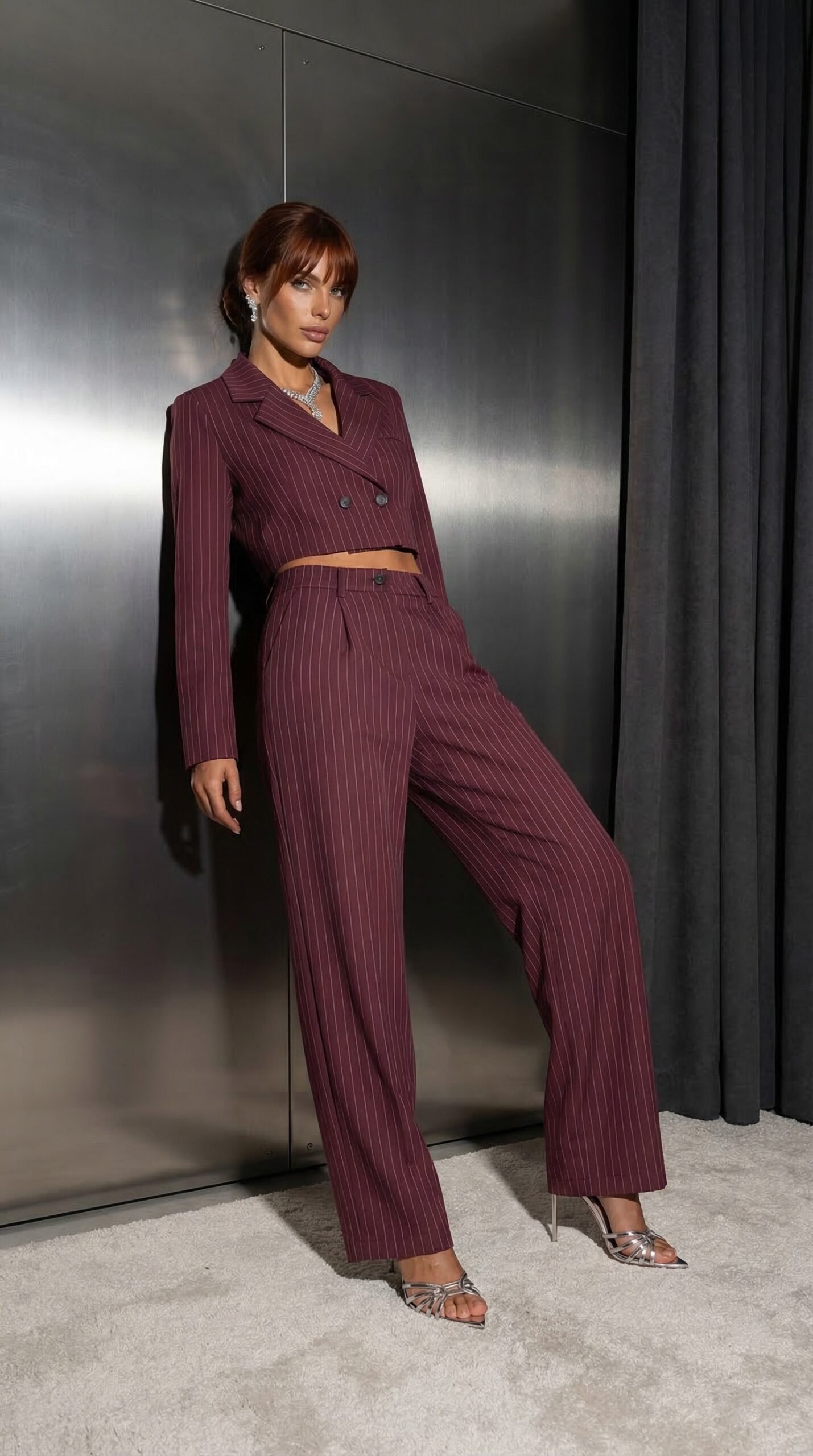 Conjunto em alfaiataria premium com padronagem risca de giz, que traduz elegância moderna com um toque fashionista marcante. Confeccionado em tecido estruturado de alta qualidade, proporciona caimento impecável, conforto e acabamento refinado.
