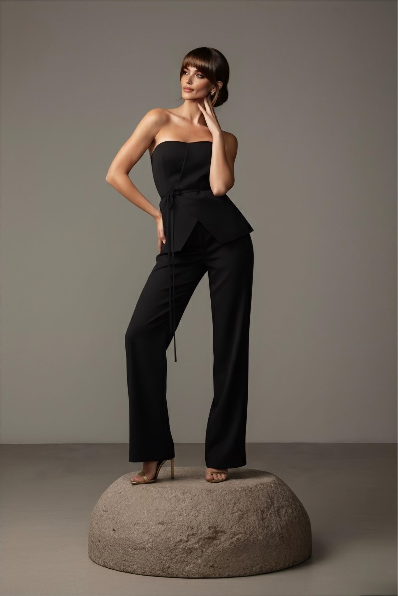 Macacão em crepe alfaiataria, moderno e sofisticado. O modelo tomara que caia traz uma silhueta clean e elegante, com recorte estruturado no busto que valoriza o colo. Na cintura, conta com amarração em faixa fina que define a silhueta e acrescenta um charme delicado. A calça tem corte reto com caimento fluido e detalhe exclusivo nos tornozelos: acabamento com punho franzido e aplicação de argola dourada, que confere um toque fashion e refinado.