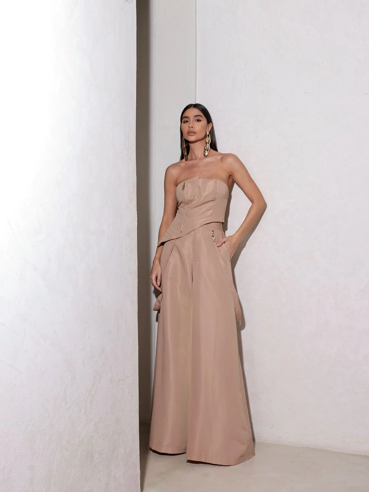 Modelagem pantalona com caimento amplo e estruturado