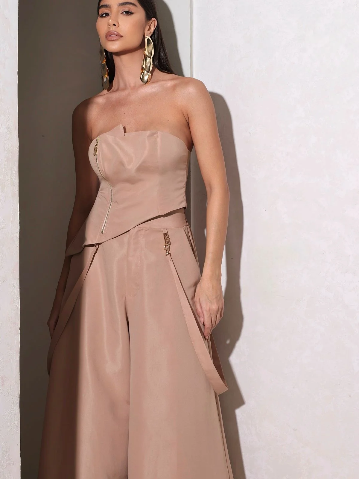 O Cropped Yanka é uma peça contemporânea que une minimalismo e impacto visual. Seu design tomara que caia com estrutura bem definida valoriza o colo e garante um toque sofisticado, enquanto os recortes assimétricos e drapeados sutis adicionam um ar de originalidade e elegância à composição.