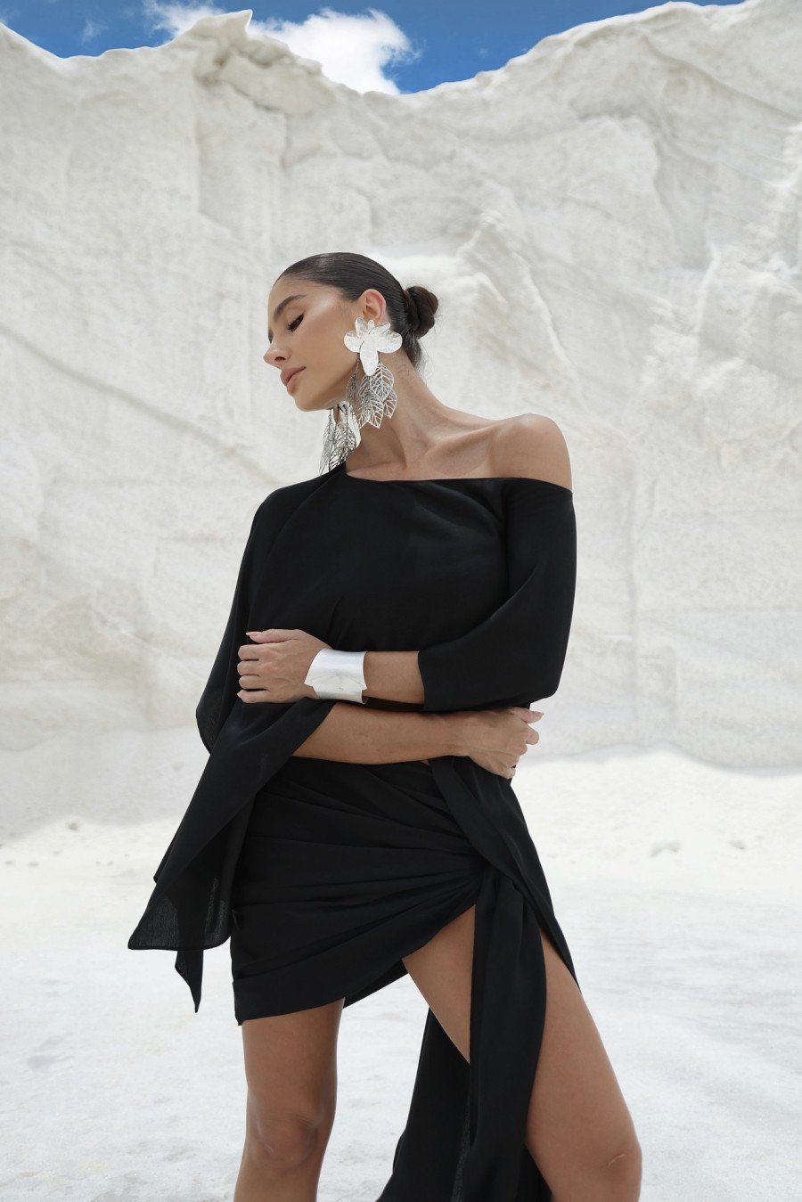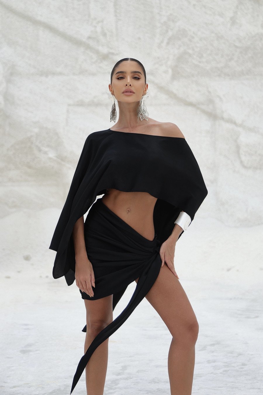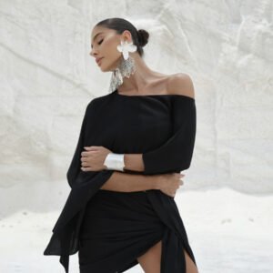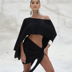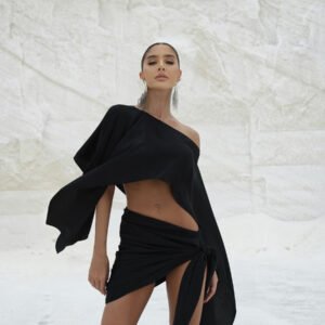 O Conjunto Zany combina sofisticação e modernidade em uma produção única composta por top cropped e saia midi de design exclusivo. O top, com modelagem solta e mangas amplas estilo morcego, garante leveza, movimento e um toque contemporâneo. Já a saia de cintura alta apresenta drapeado assimétrico frontal, criando um efeito cascata que alonga a silhueta e revela sutilmente as pernas de forma elegante.