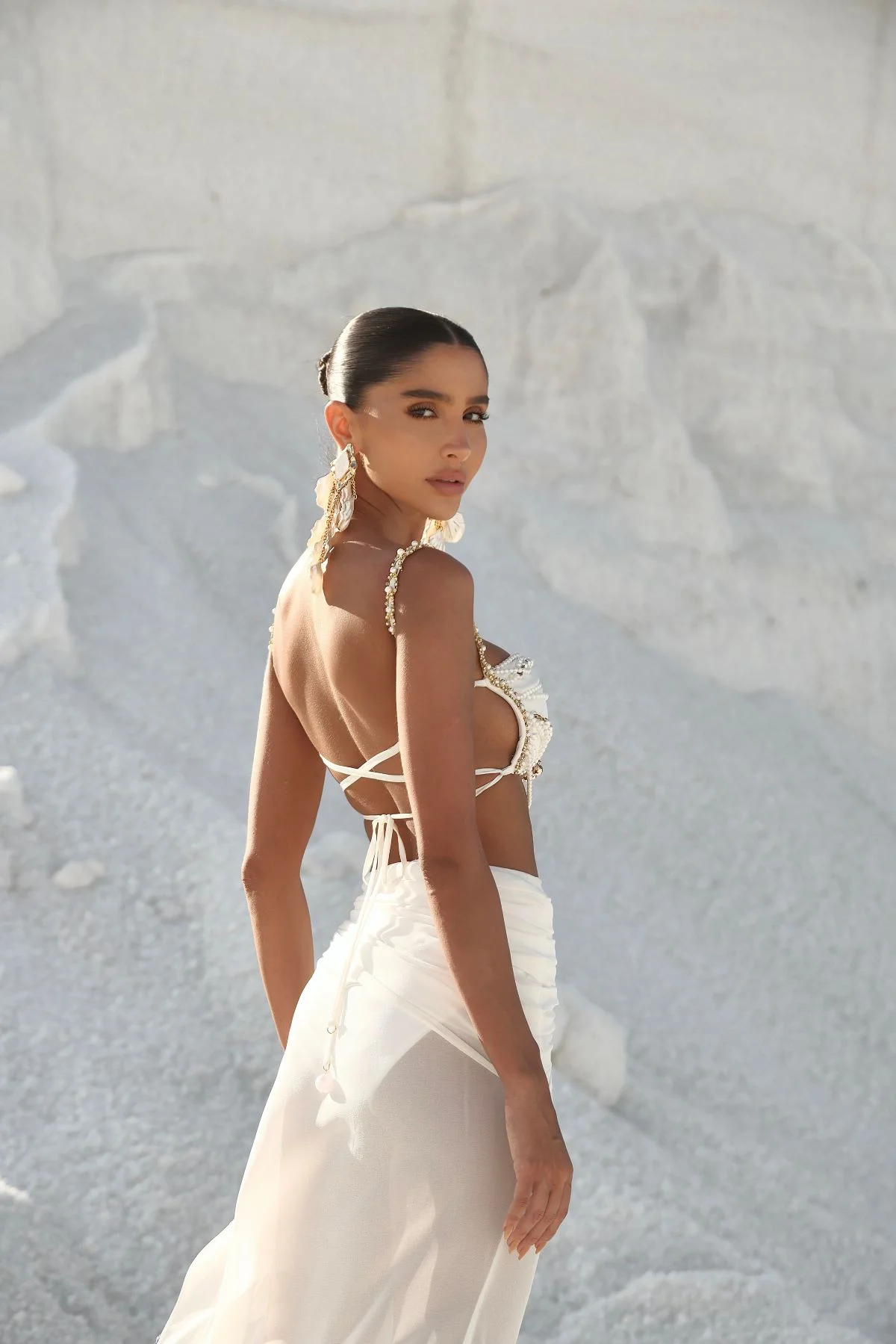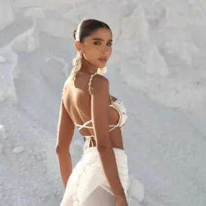 O Conjunto Zuri é a tradução perfeita do luxo artesanal com frescor contemporâneo. Composto por um top estruturado ricamente adornado por cordões, miçangas e detalhes que remetem ao estilo resort deluxe, ele se une a uma saia pareô esvoaçante que valoriza a silhueta com delicadeza e sensualidade. Um look pensado para mulheres que desejam brilhar em produções de impacto, seja à beira-mar, em eventos ao ar livre ou em ocasiões especiais que pedem sofisticação etérea.