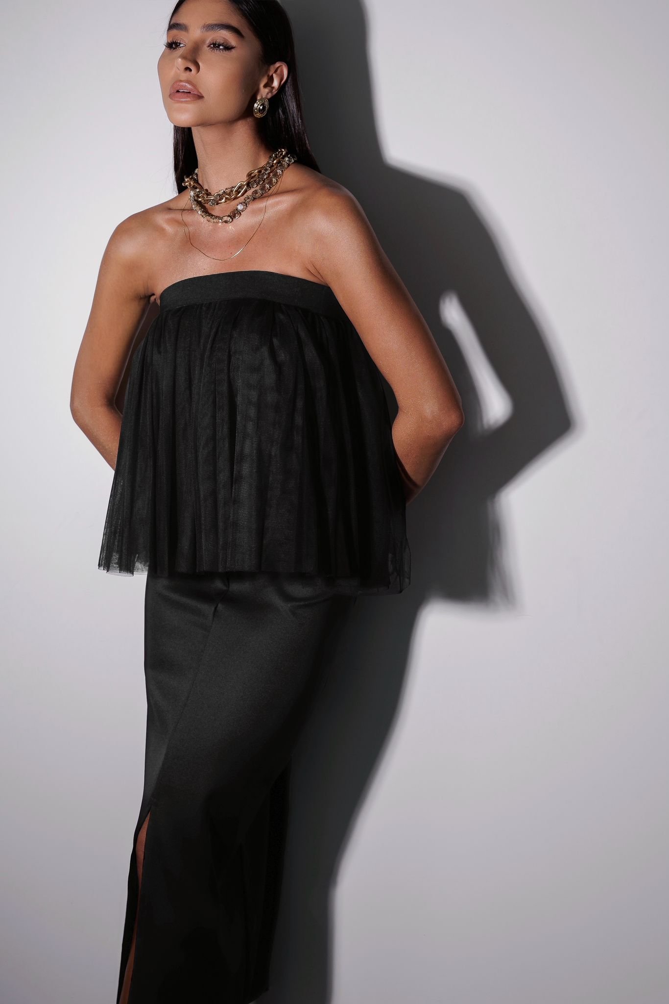 O modelo tomara que caia, com faixa estruturada no busto, valoriza o colo e garante sustentação, enquanto o caimento fluido do tule traz movimento e leveza à produção. Sua versatilidade permite o uso também como saia de cintura alta, transformando completamente o visual — basta ajustar a posição da peça para criar uma nova proposta fashion.