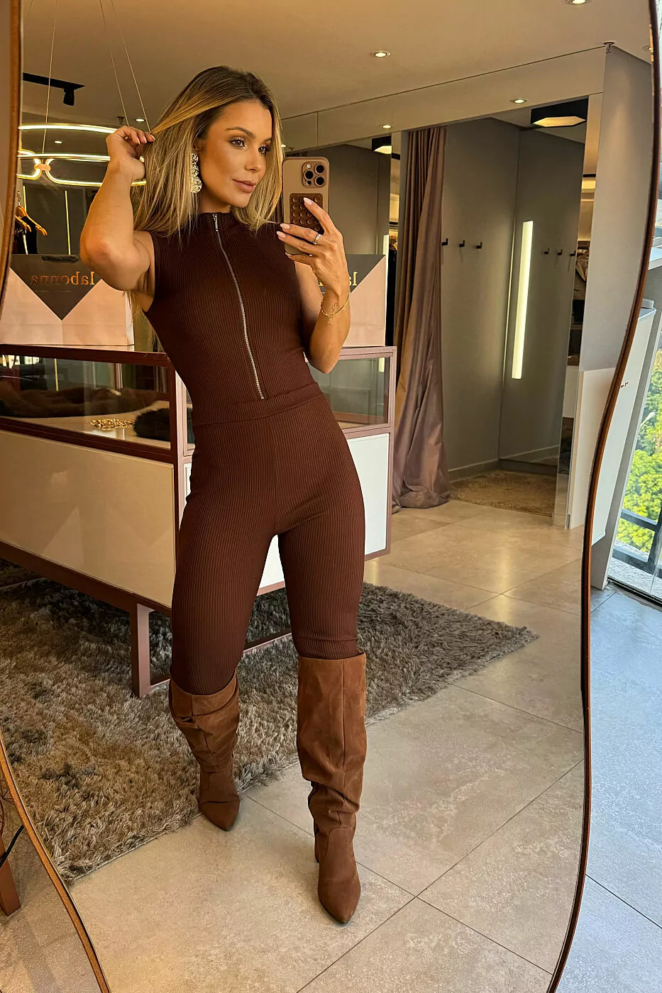 Macacão em malha Allure canelada, com modelagem bem encorpada, contém ziper frontal na parte do busto.