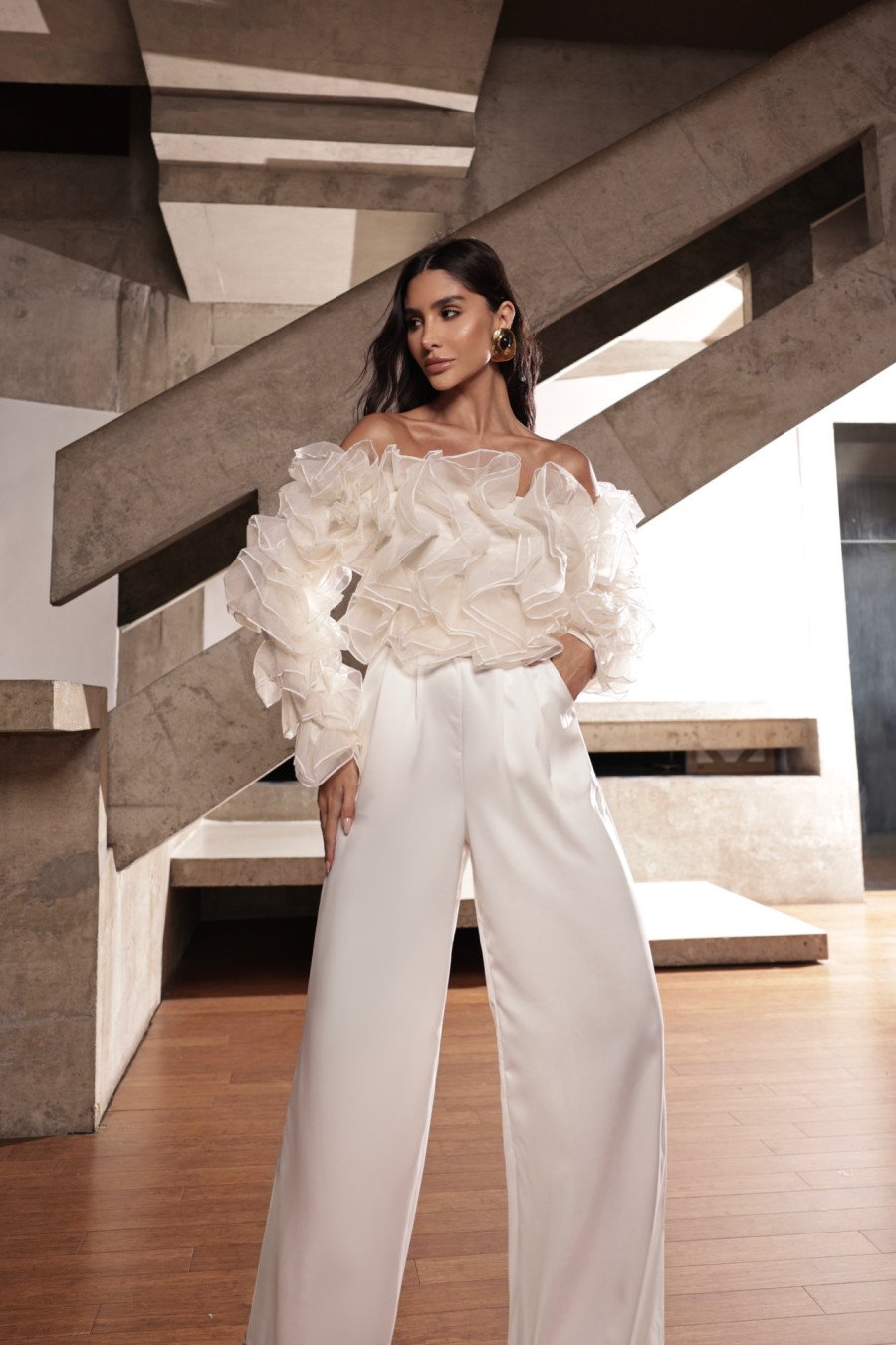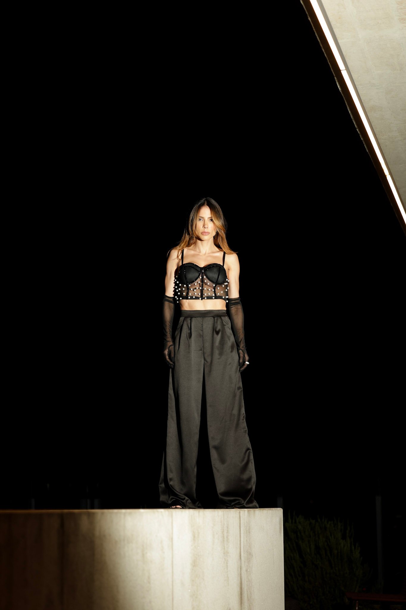 Com modelagem pantalona ampla, a calça alonga a silhueta e proporciona leveza a cada passo. O cós alto com amarração frontal adiciona charme e permite ajuste confortável, valorizando a cintura de forma elegante.