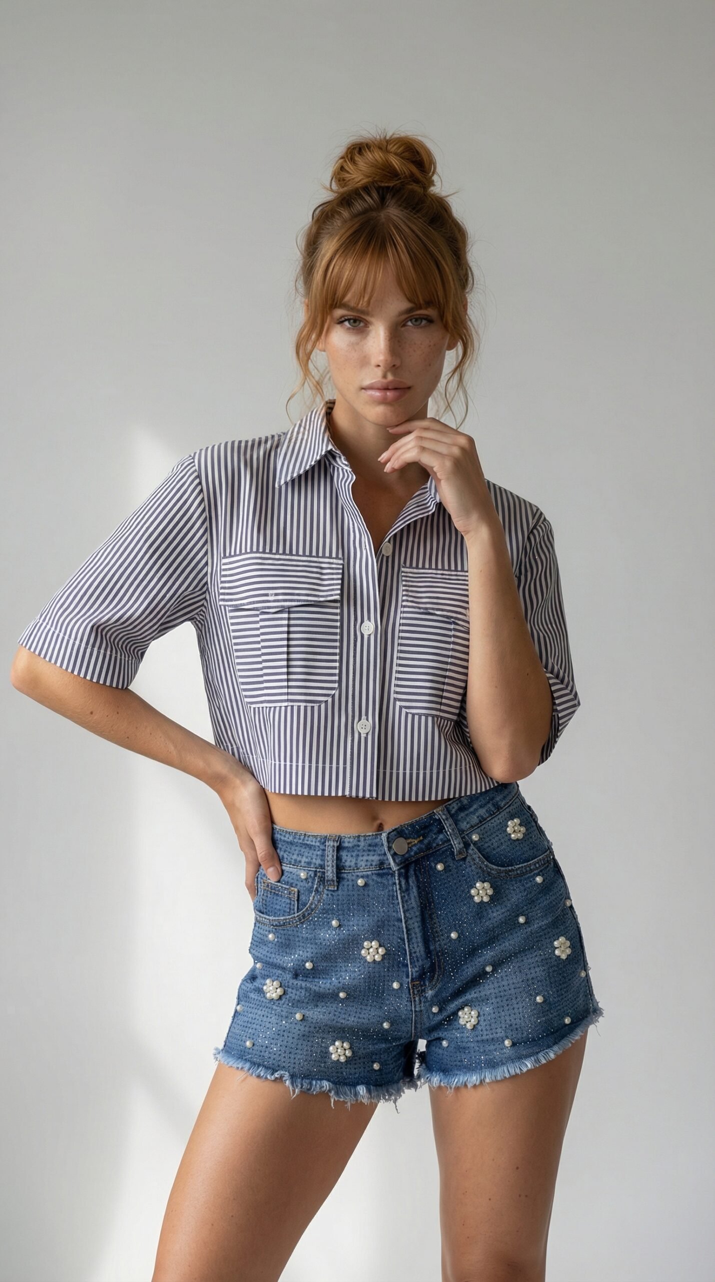 O diferencial está na rica aplicação de flores e pérolas, que elevam o denim a um item de destaque em qualquer produção. Com modelagem pensada no conforto e estilo, ele possui bolsos laterais modelo faca — que remetem à sofisticação da alfaiataria — e bolsos funcionais na parte de trás.