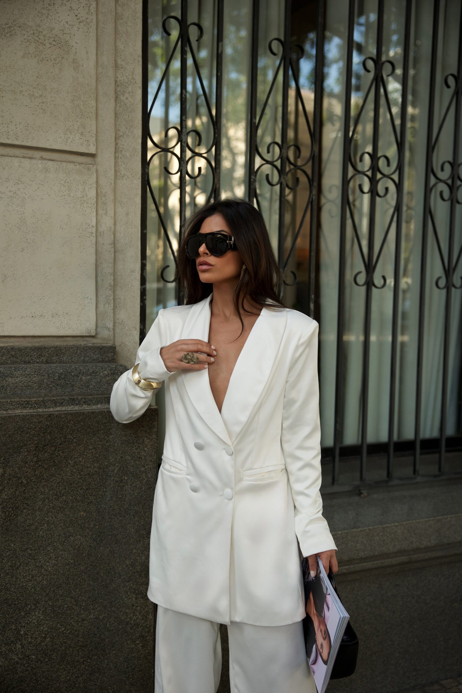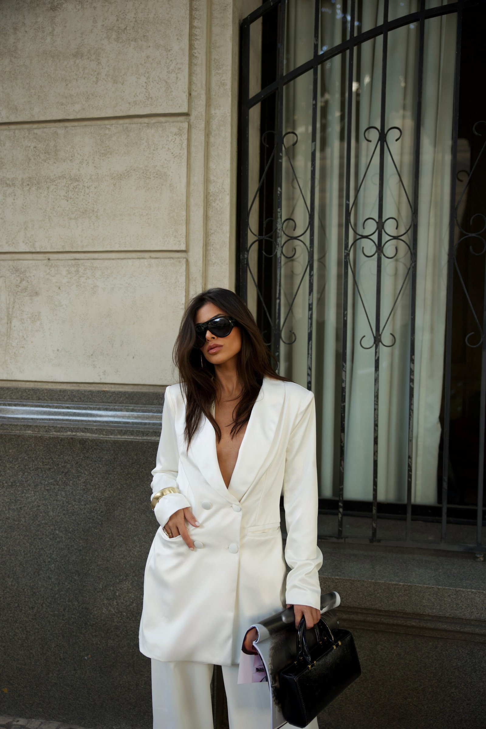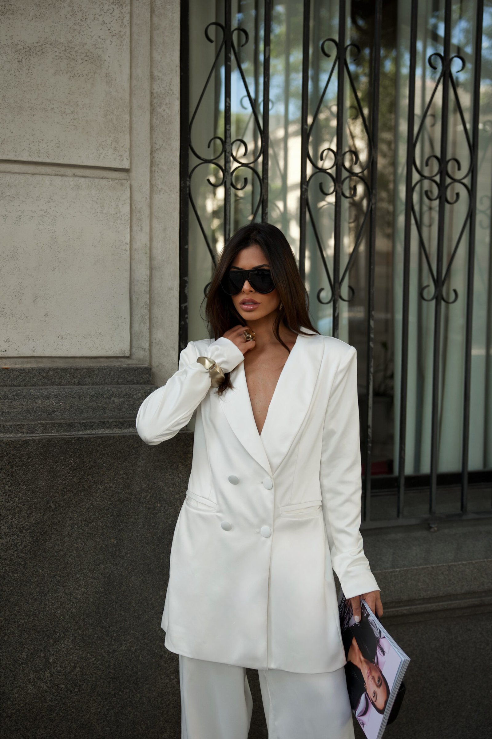 Uma peça-chave para mulheres que desejam um visual imponente, elegante e atual, unindo a força da alfaiataria ao glamour do acetinado.