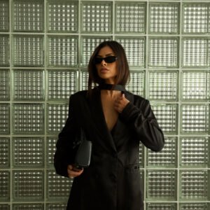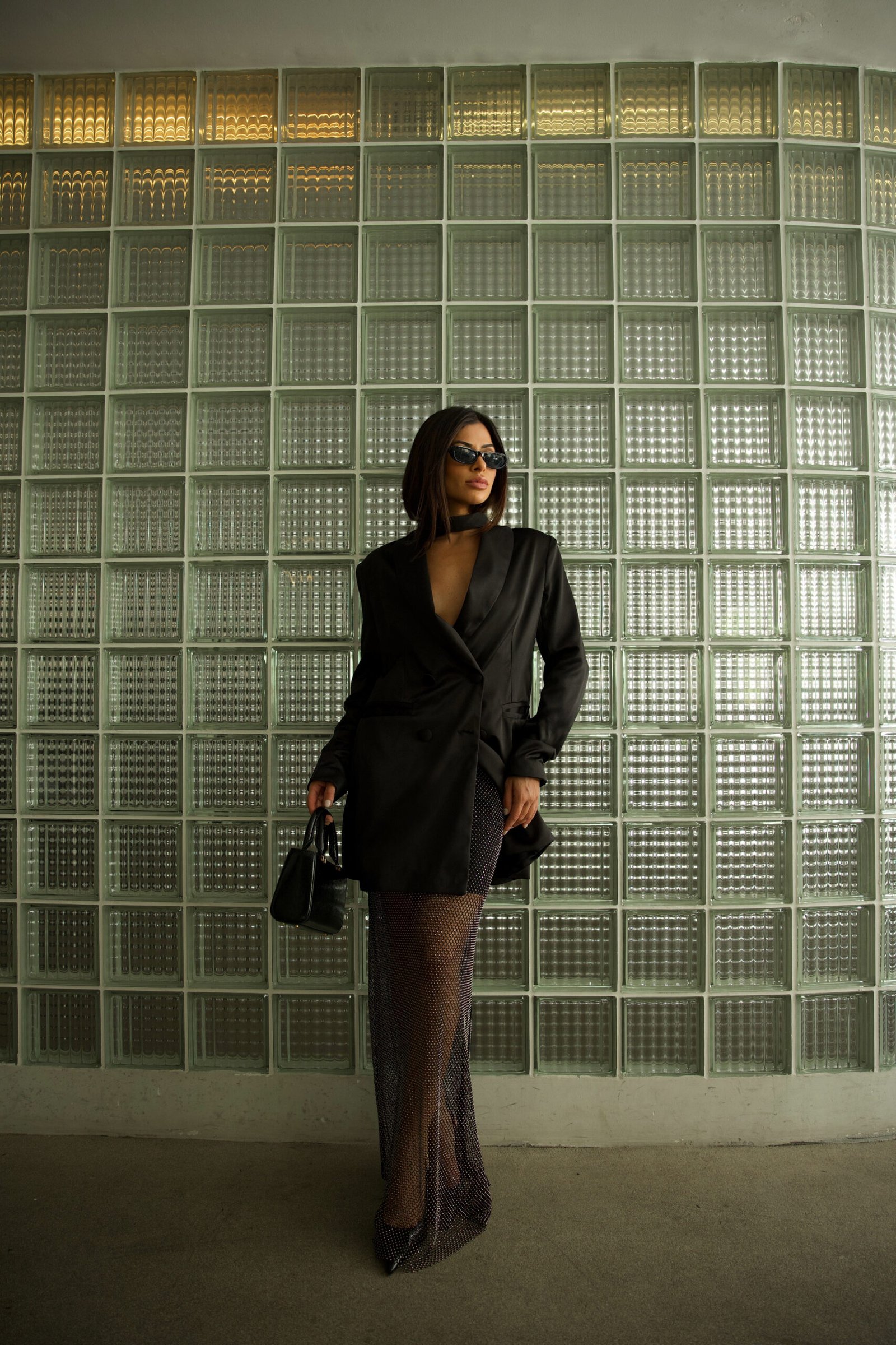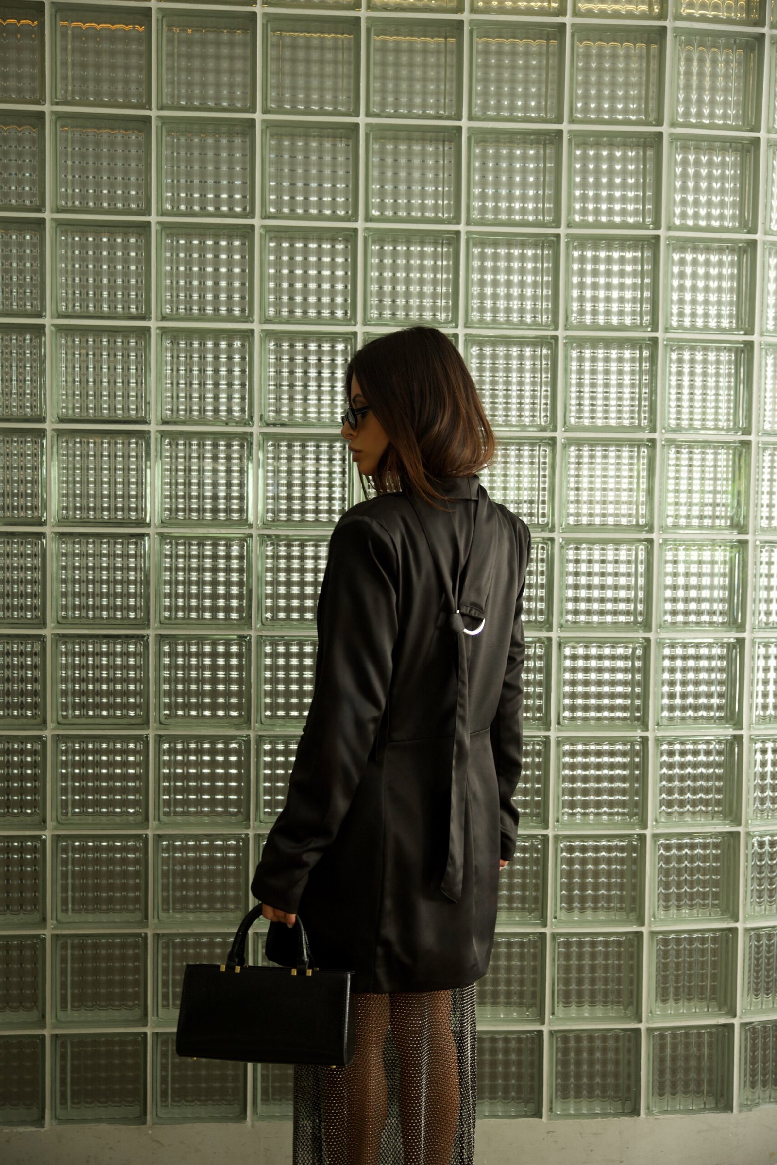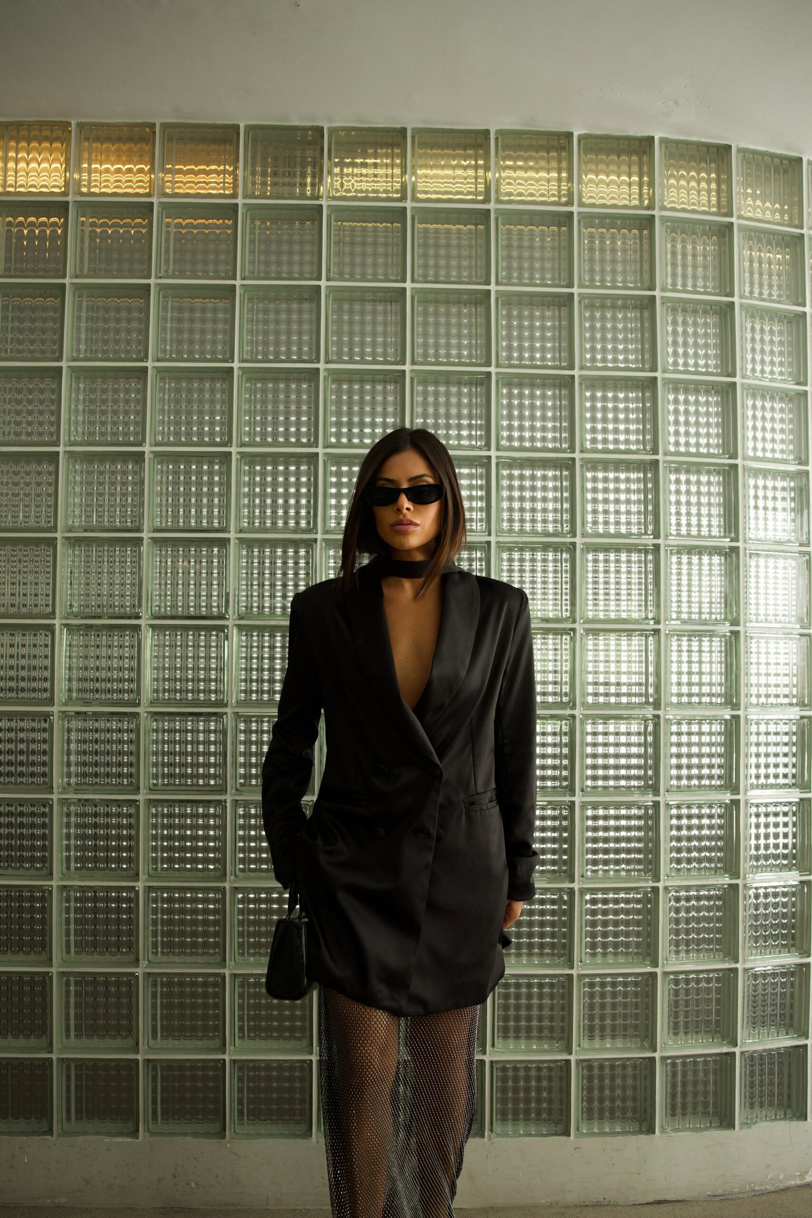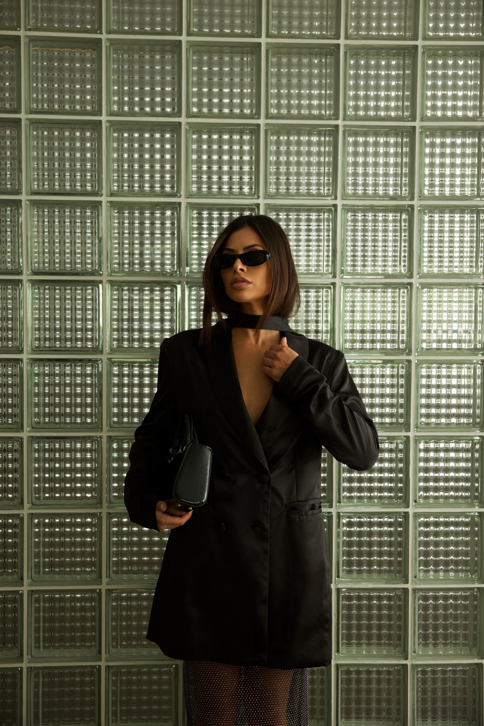 O vestido blazer em crepe acetinado é a tradução perfeita da elegância contemporânea com atitude fashion. Com leve brilho sofisticado e toque macio, o tecido garante caimento impecável e visual refinado, ideal para produções modernas e poderosas.