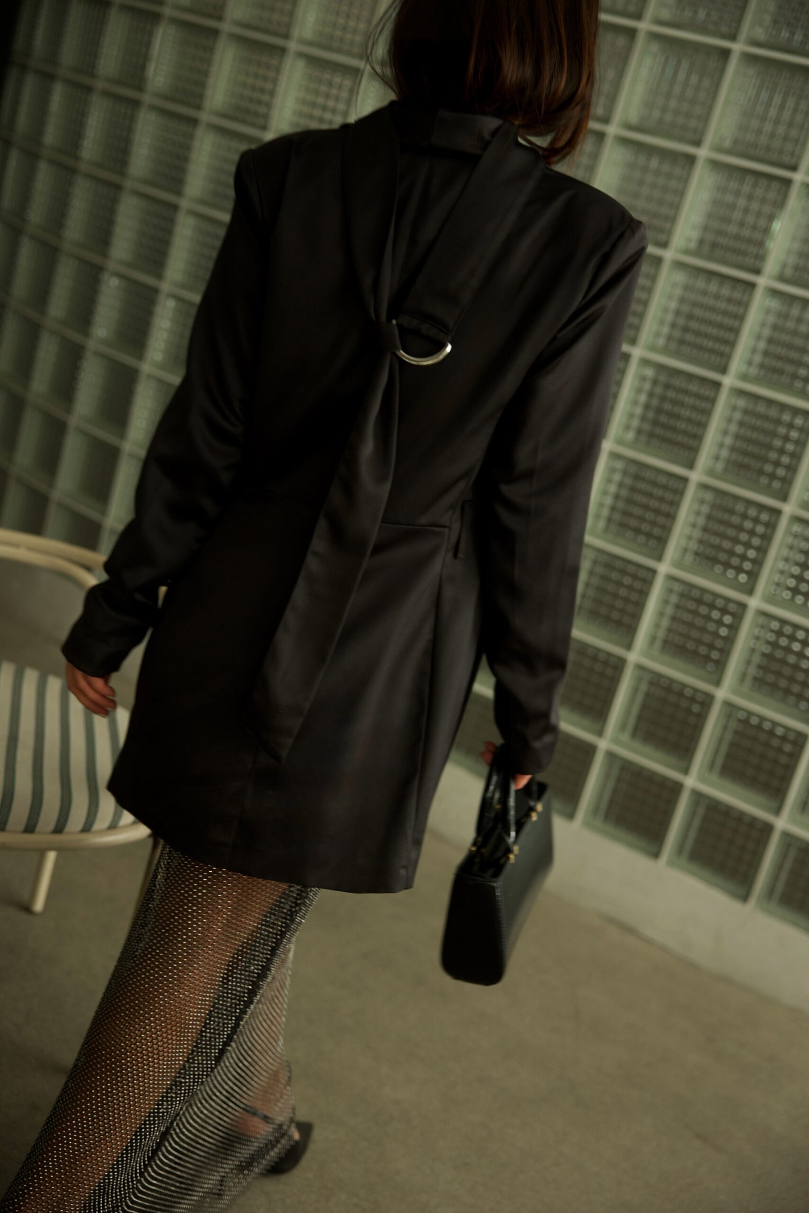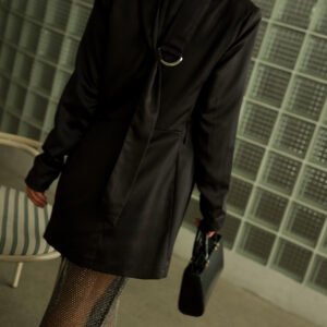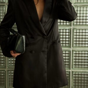 A modelagem estilo blazer alongado traz inspiração da alfaiataria, com lapela clássica, decote profundo em V e fechamento frontal por botões, valorizando o colo e alongando a silhueta. O corte estruturado confere presença e sofisticação, enquanto o acabamento acetinado eleva a peça a um nível premium.