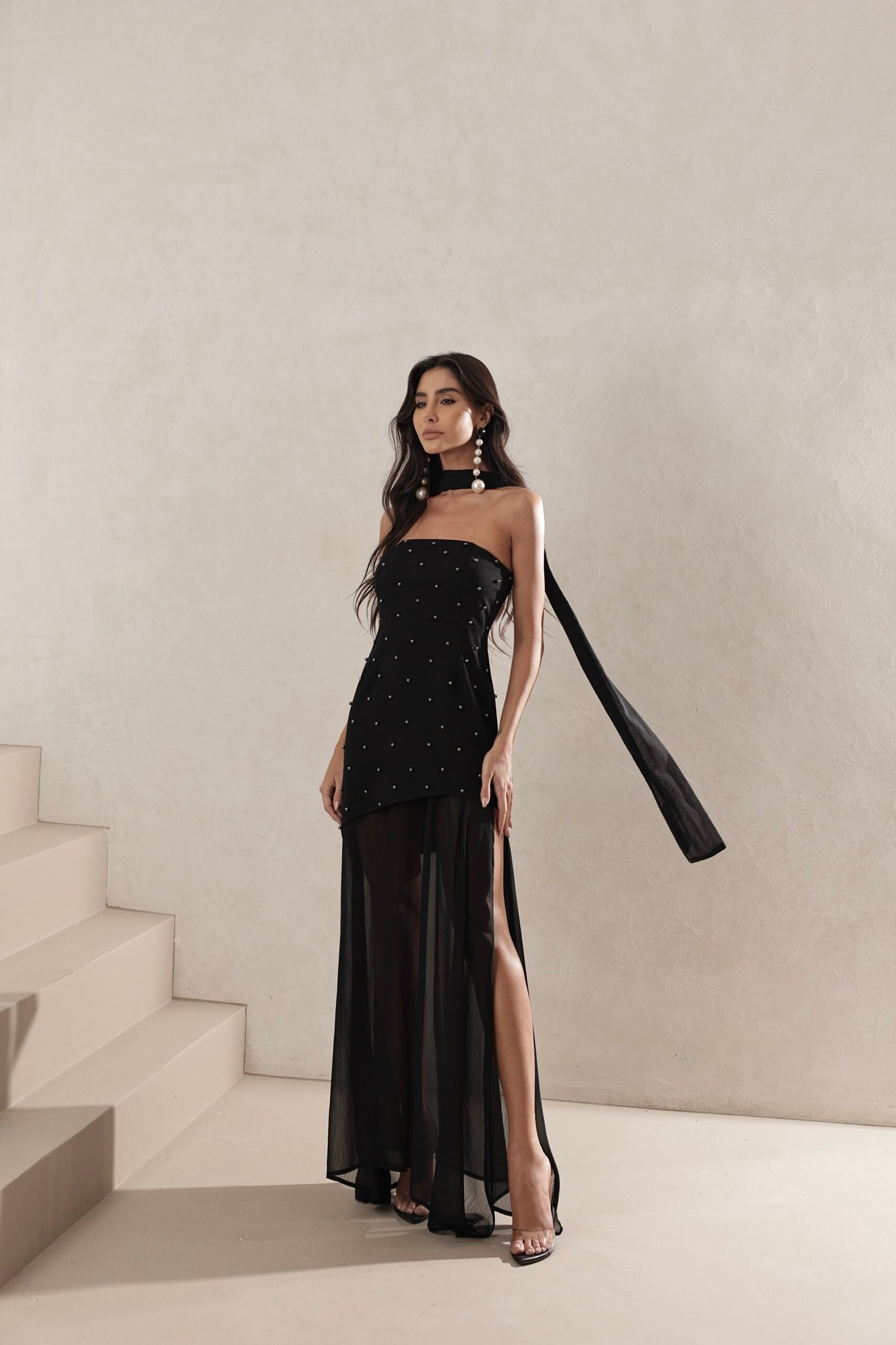 O diferencial está no decote profundo combinado ao choker removível aplicado com pérolas, criando um efeito refinado e exclusivo. O detalhe torna a peça ainda mais marcante, reforçando o contraste entre minimalismo moderno e acabamento artesanal.