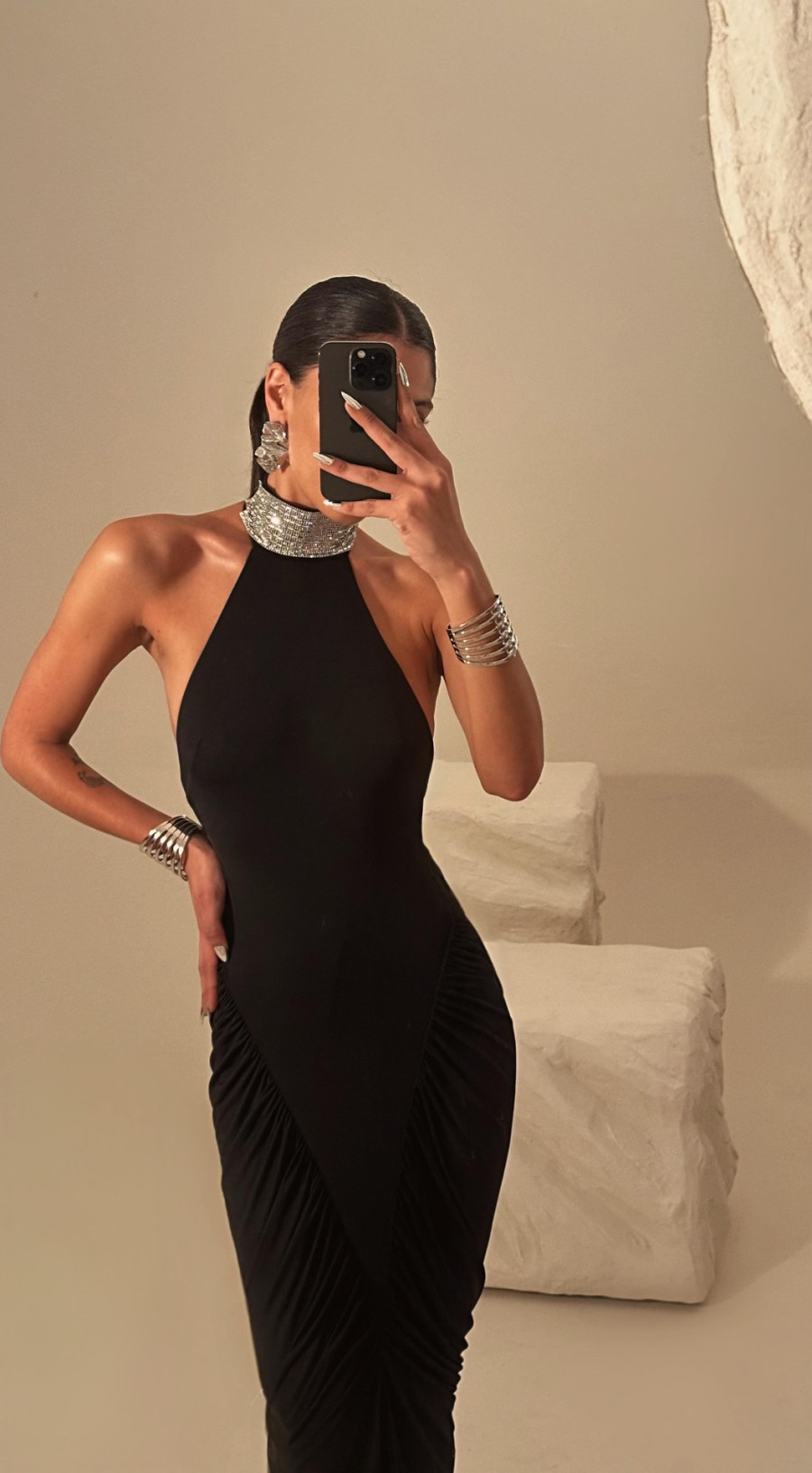 Um modelo que une sofisticação e modernidade em cada detalhe. O vestido longo Nik é confeccionado em micro fluid, trazendo caimento impecável e toque leve ao visual. Seu design clean é realçado pelo decote halter com gola adornada em brilho metálico, que valoriza o colo com elegância. As pregas delicadamente estruturadas na parte frontal criam um efeito de movimento e refinamento, finalizando em uma fenda sutil e charmosa. Uma peça que traduz luxo minimalista, perfeita para ocasiões especiais.