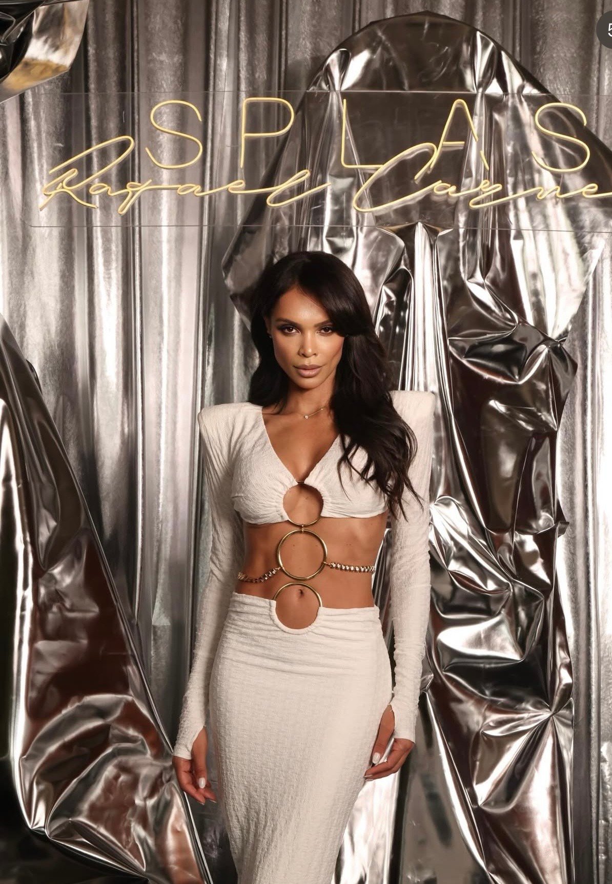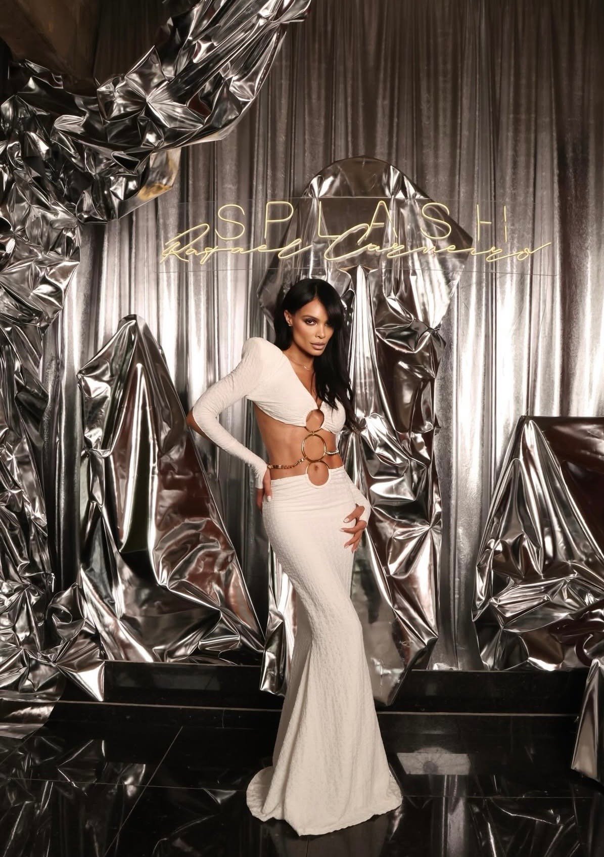 O Vestido Longo Noor é a perfeita expressão de um glamour moderno e escultural, combinando a elegância da manga longa com a ousadia de recortes estratégicos (cut-outs) em uma composição de alto impacto visual.