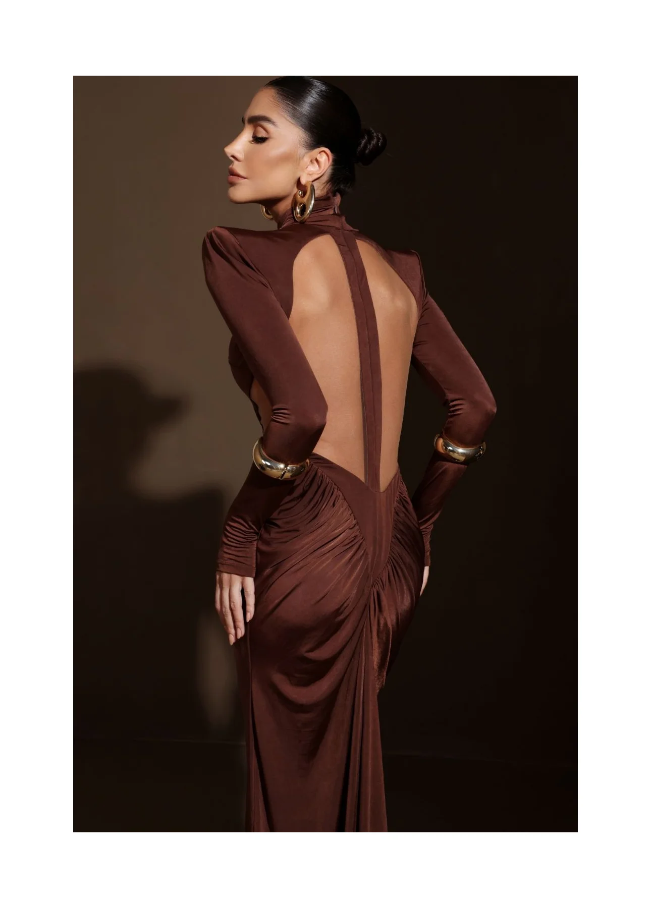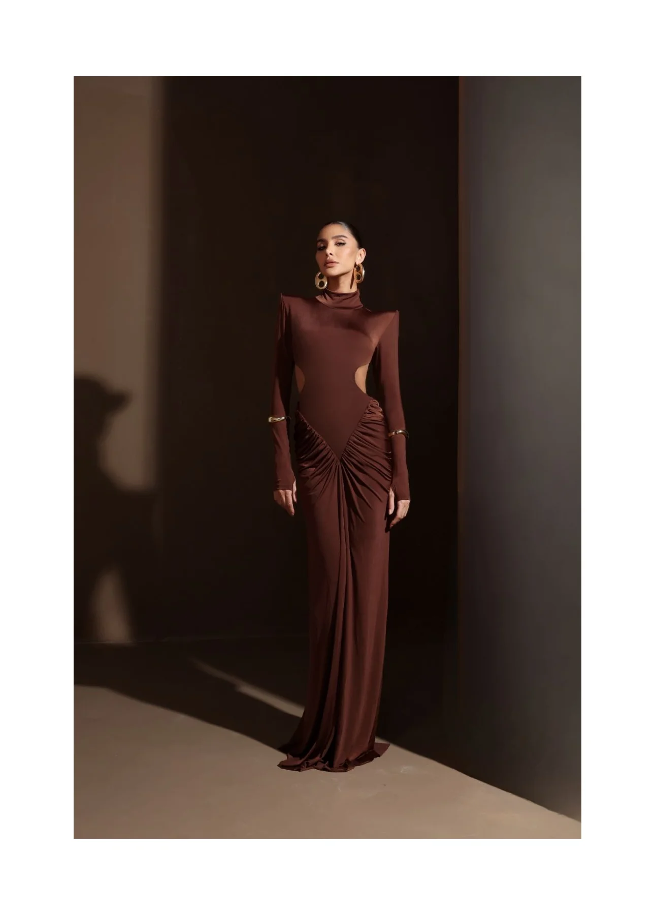 Vestido longo Yume é a definição de elegância sofisticada com um toque de ousadia. Confeccionado em jersey, ele combina conforto e caimento impecável, valorizando cada curva do corpo. Com modelagem justa, gola alta e mangas longas, é uma peça poderosa que equilibra sensualidade e sofisticação. As ombreiras estruturam a silhueta, adicionando imponência ao visual. Ideal para ocasiões noturnas ou eventos que pedem um look marcante.