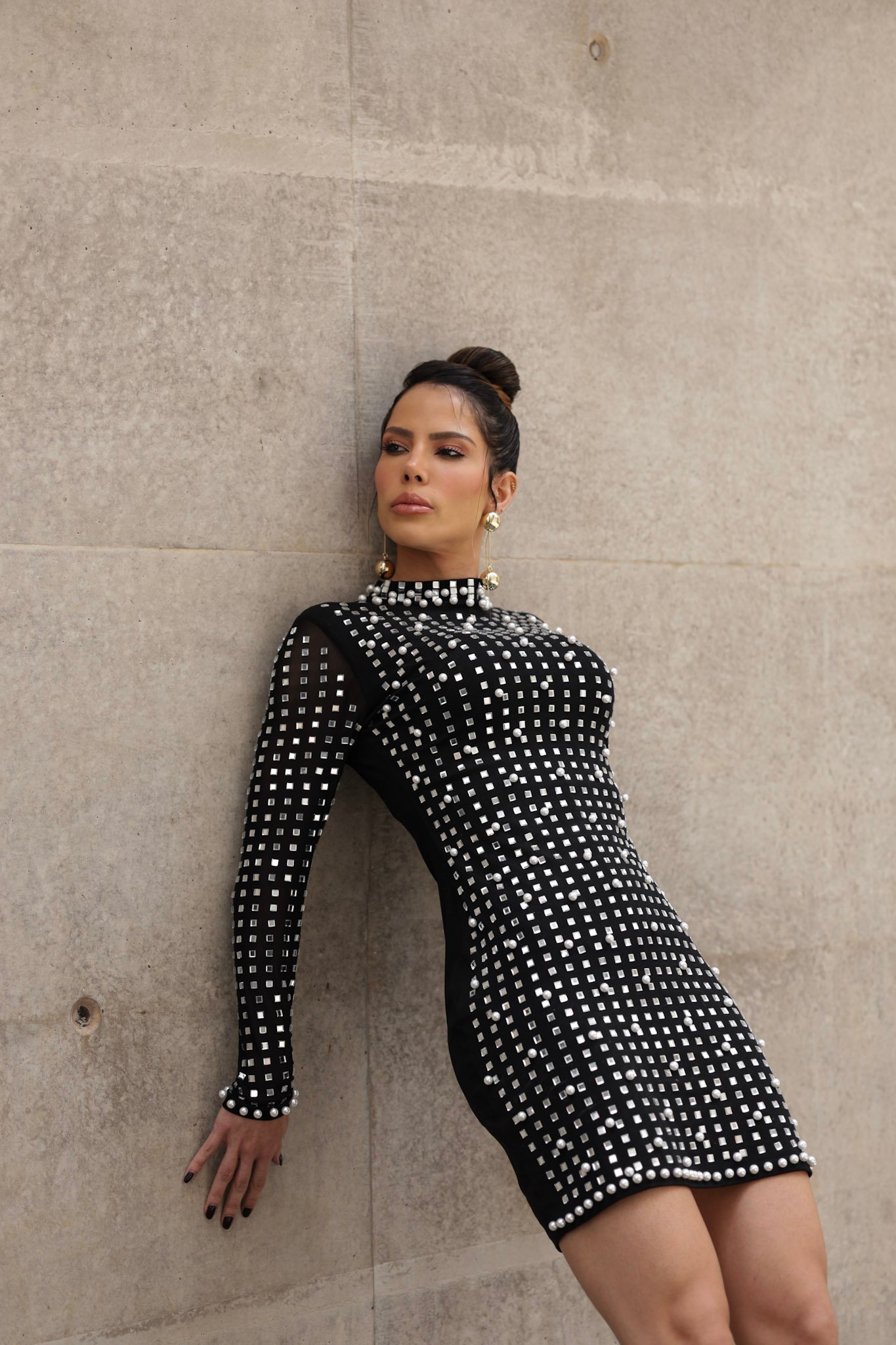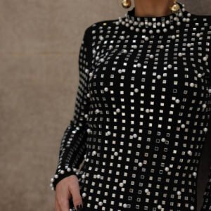Seu grande destaque é o trabalho exclusivo de aplicação de strass por toda a peça, criando um visual glamouroso e elegante. As mangas longas transparentes, também adornadas com strass, adicionam ainda mais charme e refinamento ao look.