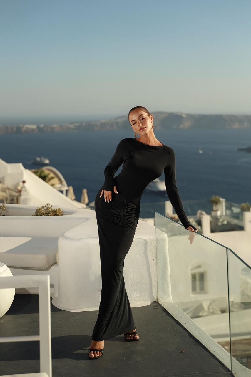 Caracteristica Principal: Vestido longo com modelagem justa com detalhe de franzido frente e costas em malha fluit.