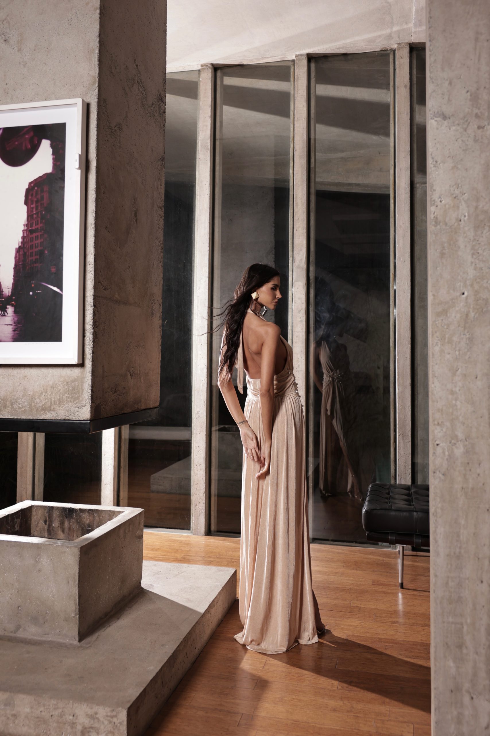 O vestido longo em lurex traz um glamour sofisticado e moderno. Com decote profundo transpassado, ele valoriza o colo com sensualidade elegante. A cintura apresenta um drapeado com nó lateral que realça a silhueta, criando um efeito alongado impecável.