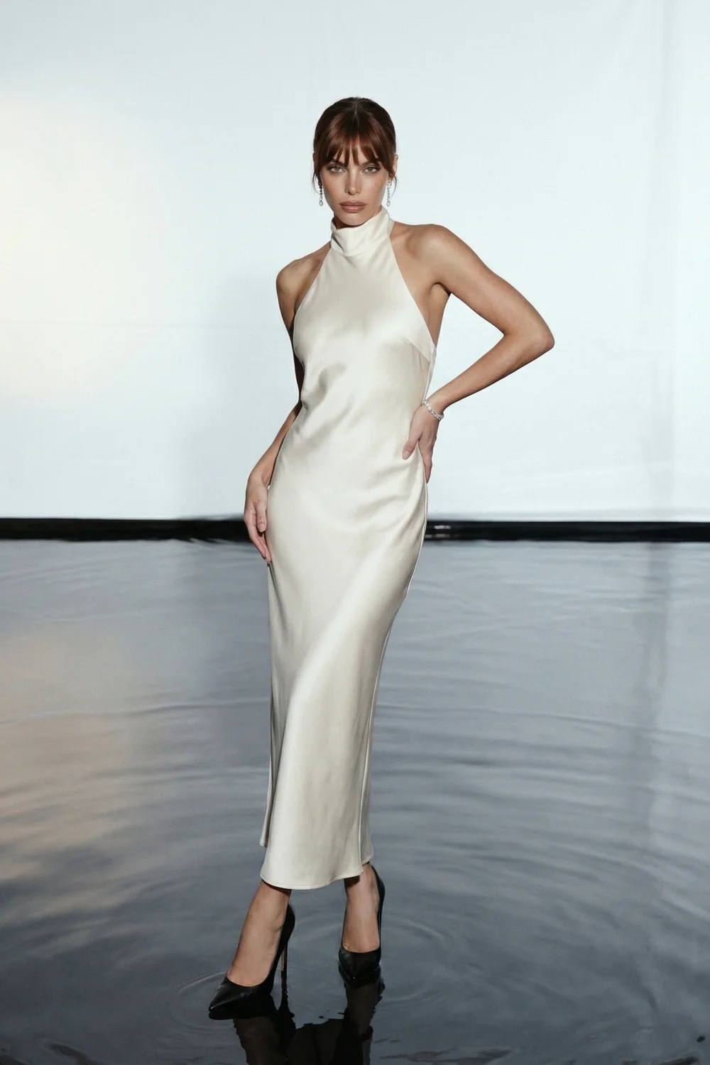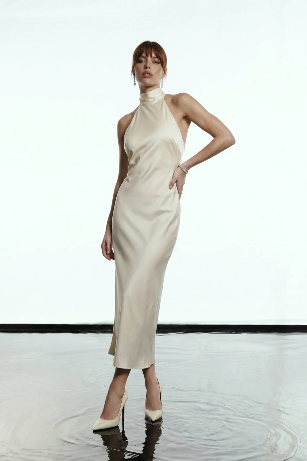 O Vestido Renata é a personificação da elegância minimalista com um toque de ousadia sofisticada. Confeccionado em Crepe Acetinado, o modelo possui um brilho discreto e um caimento fluido que exala nobreza. Sua modelagem Halter Neck com gola alta valoriza o colo e os ombros, criando uma linha vertical que alonga a silhueta com maestria.