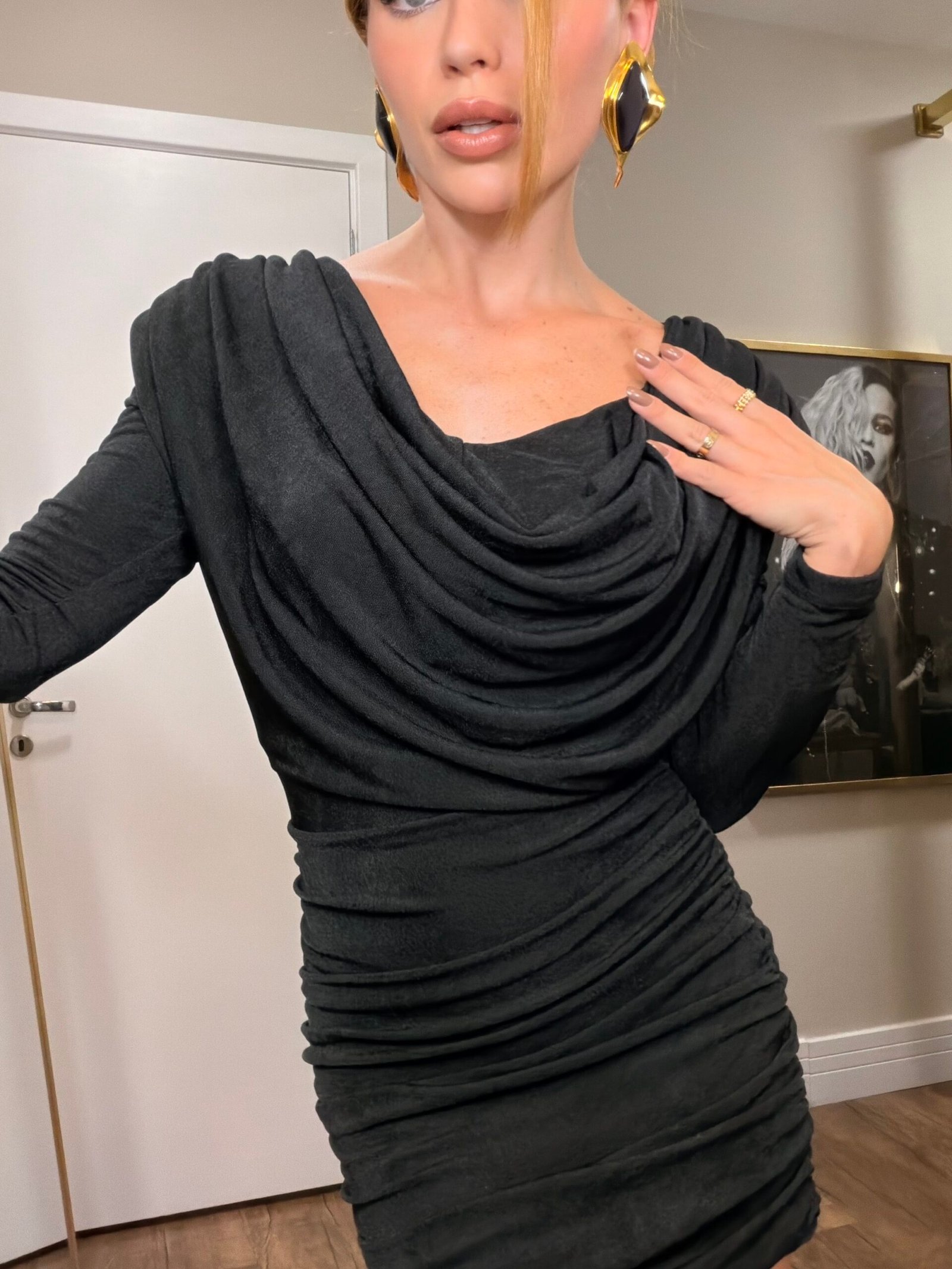 O design destaca-se pelas ombreiras estruturadas, que trazem imponência e um ar “fashionista” à silhueta. Com mangas longas e modelagem justa na cintura, o vestido cria um efeito visual de elegância imediata. O caimento sem bojo prioriza o conforto e a sofisticação natural, tornando-o uma peça versátil para jantares, eventos sociais ou festas.