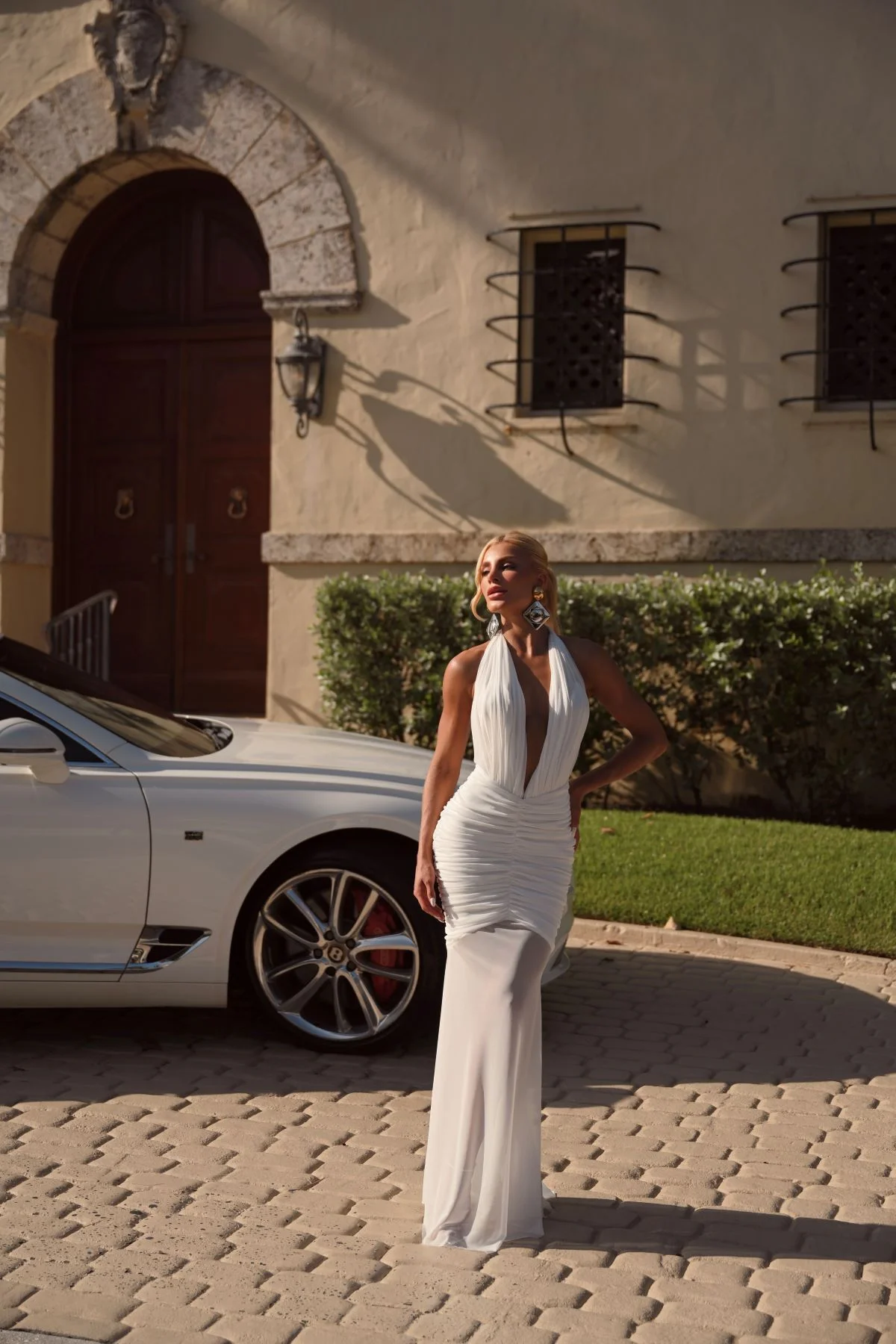 Uma peça que traduz sofisticação e sensualidade em cada detalhe. O vestido Thyla é confeccionado em tule leve com drapeado preciso que esculpe a silhueta de forma elegante e fluida. O decote profundo e o caimento alongado trazem impacto visual, enquanto a transparência sutil garante um toque de ousadia na medida certa. Acompanha bolero em tule, permitindo múltiplas possibilidades de styling — dos ombros à mostra ao visual mais elegante e coberto. Uma peça versátil e imponente, ideal para ocasiões noturnas que pedem presença marcante.